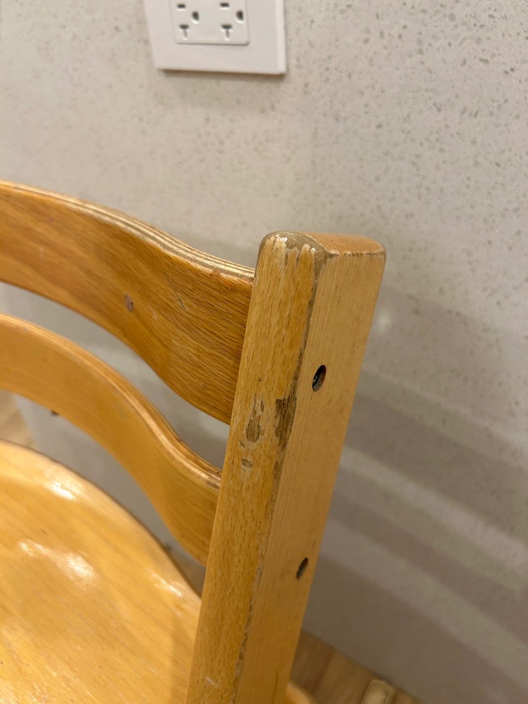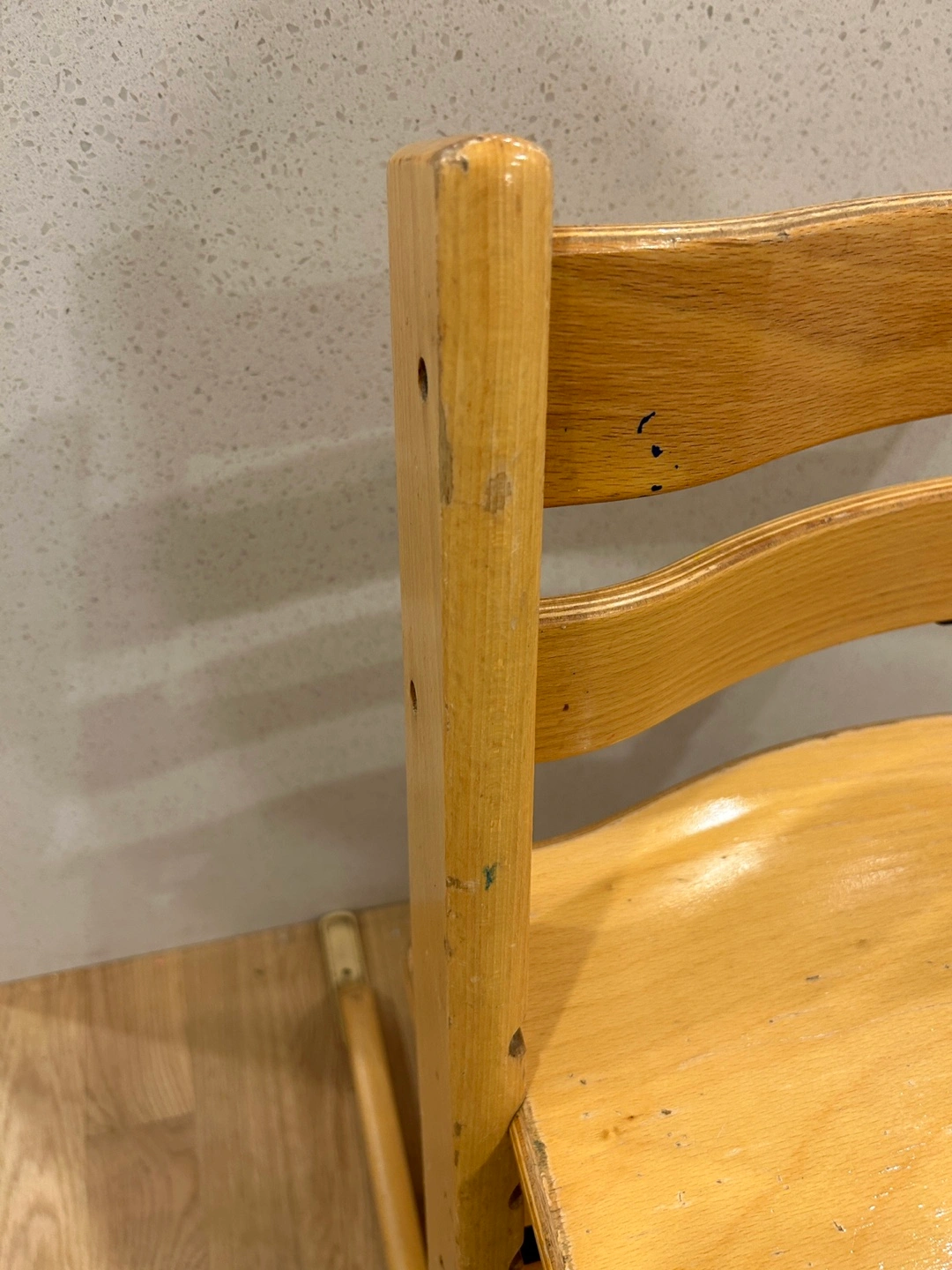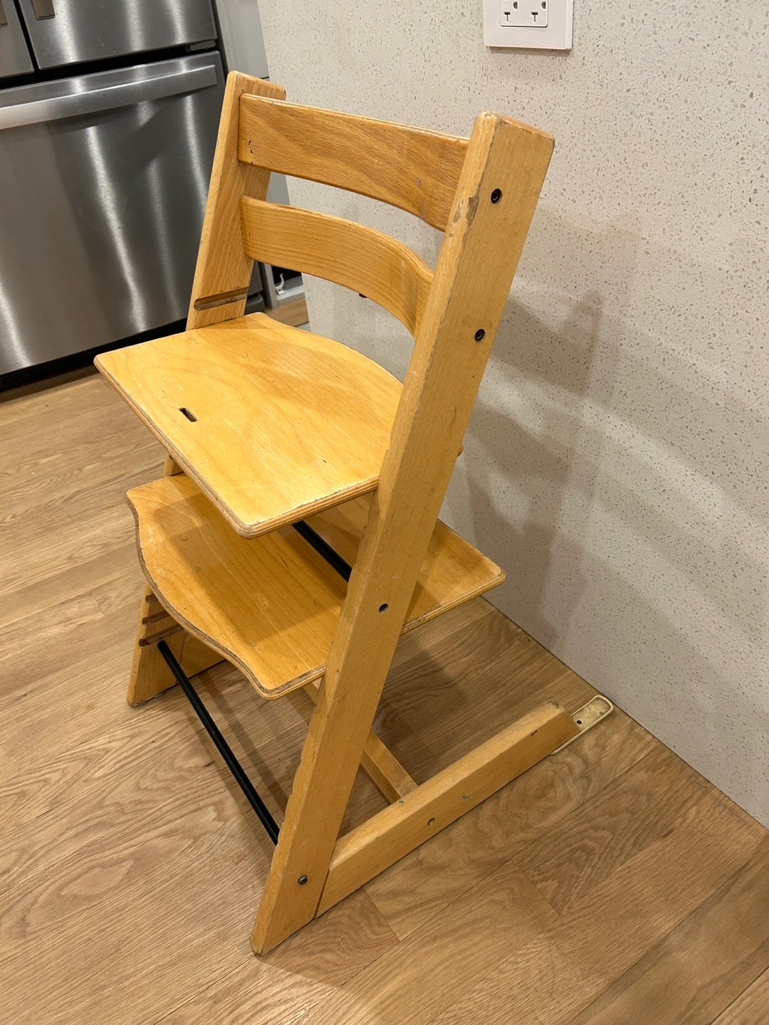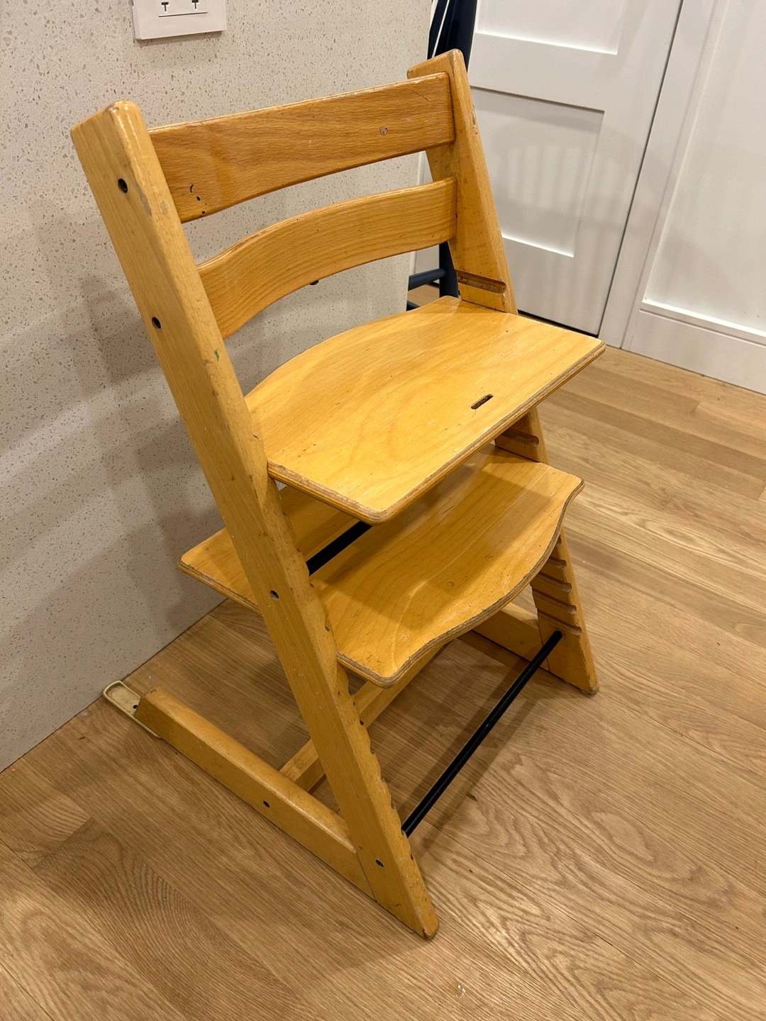 Stokke Tripp Trapp wooden high chair. Adjustable height. Shows some wear. Good condition overall. Does not include harness/babyset, tray or any other accessories. This chair has been well loved - some wear on finish but still lots of years to go!