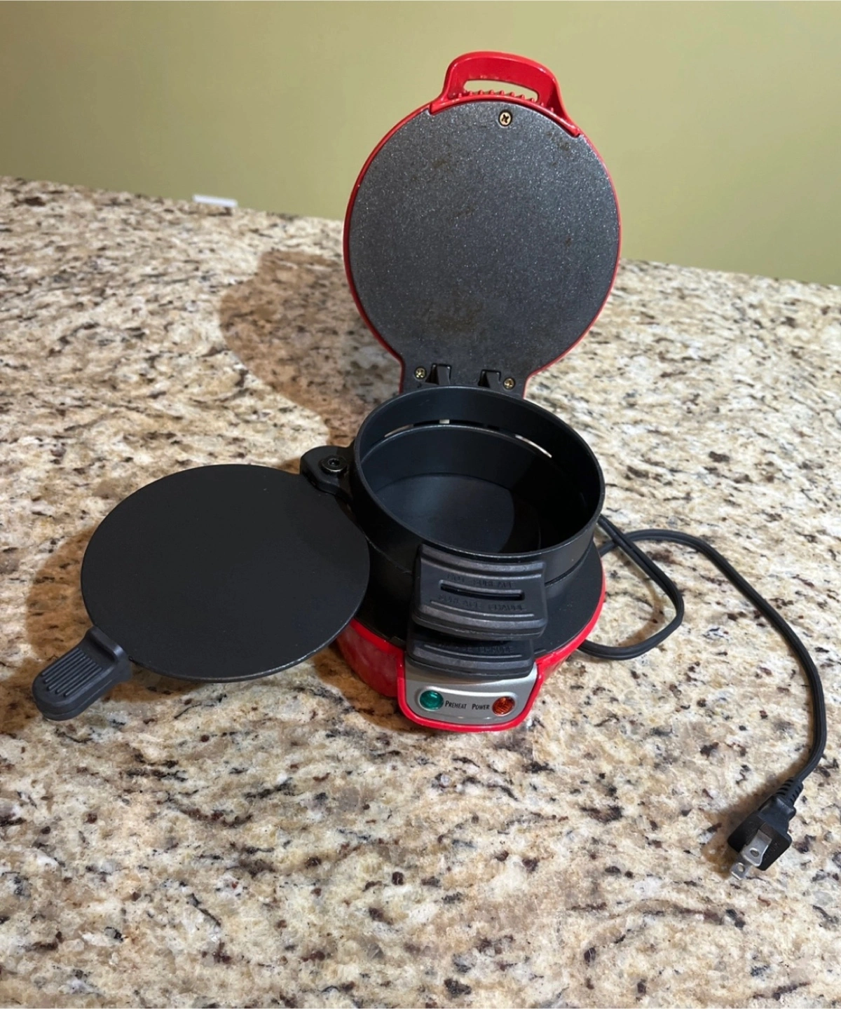 Compact red sandwich maker. Great for quick breakfasts. Includes instruction manual. Used only once. Free recipe book!