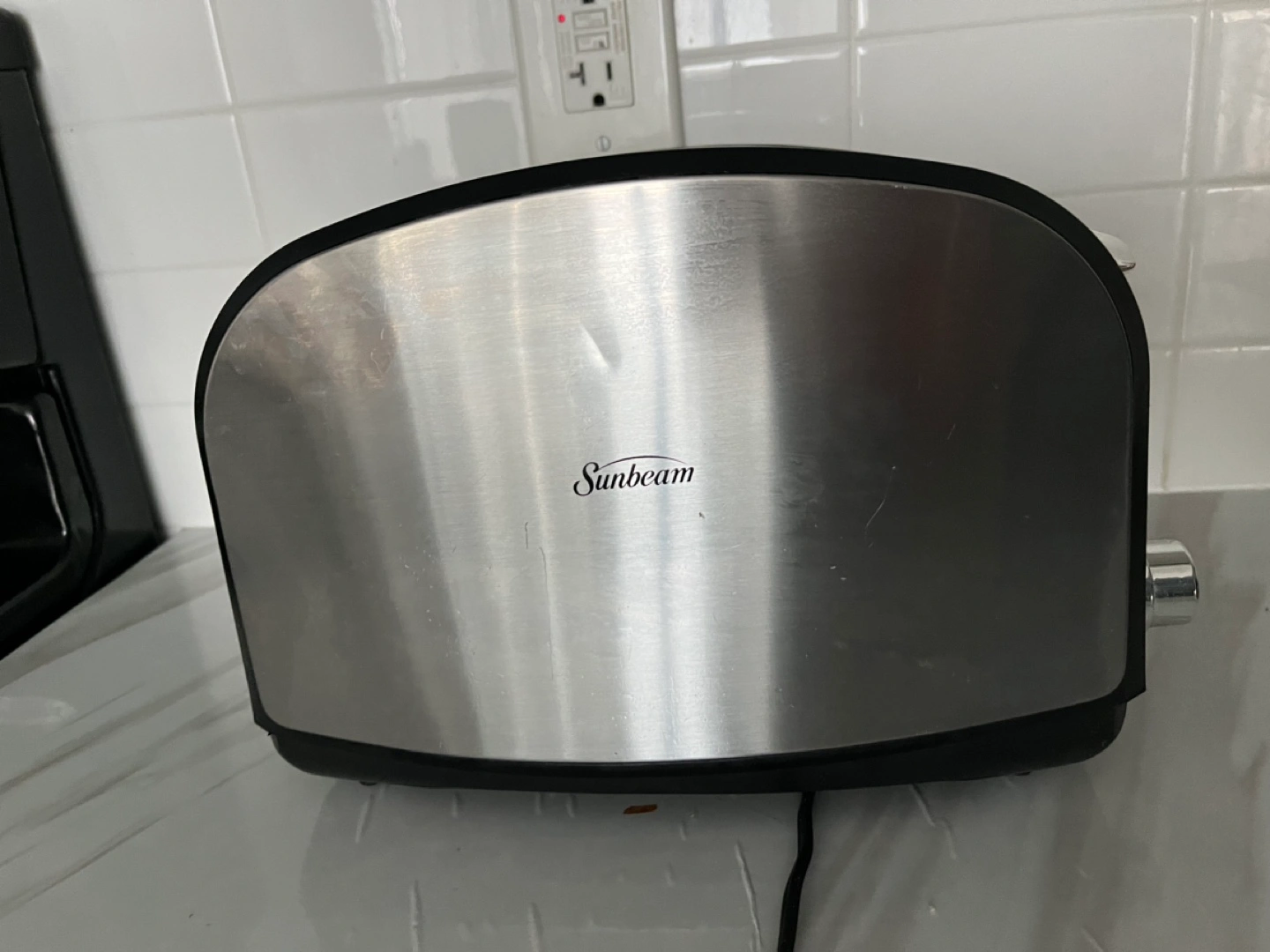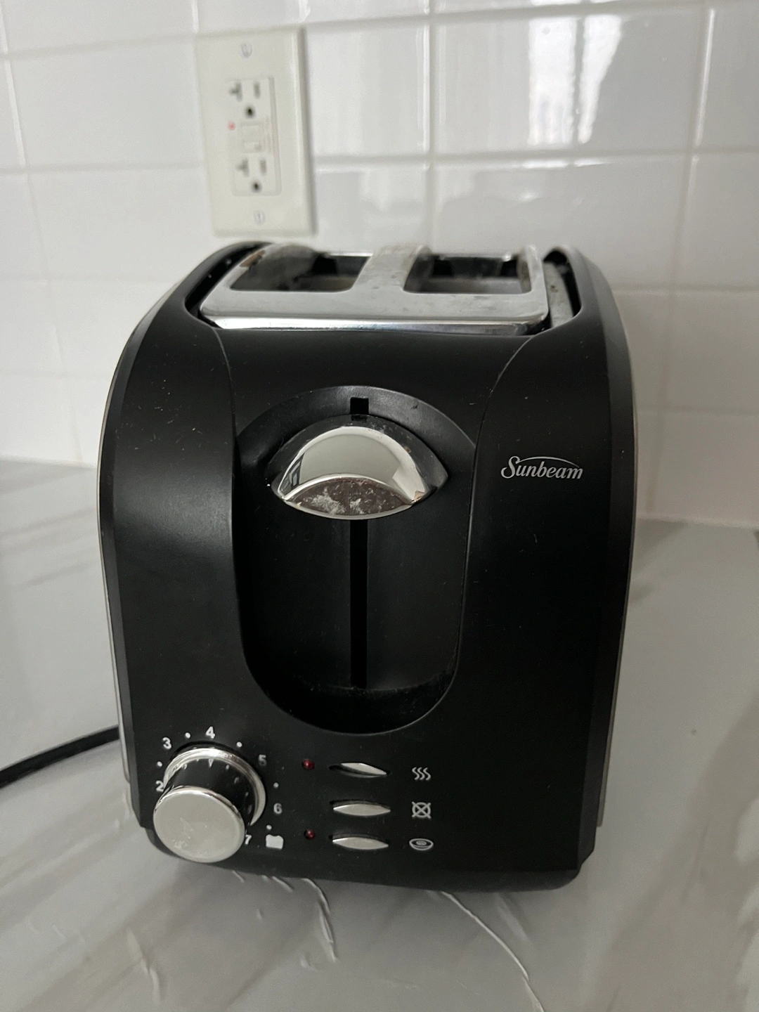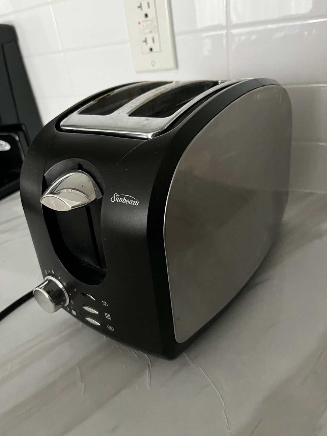Sunbeam two-slice toaster. Black and stainless steel finish. Features adjustable browning control and defrost setting. Minor signs of wear.