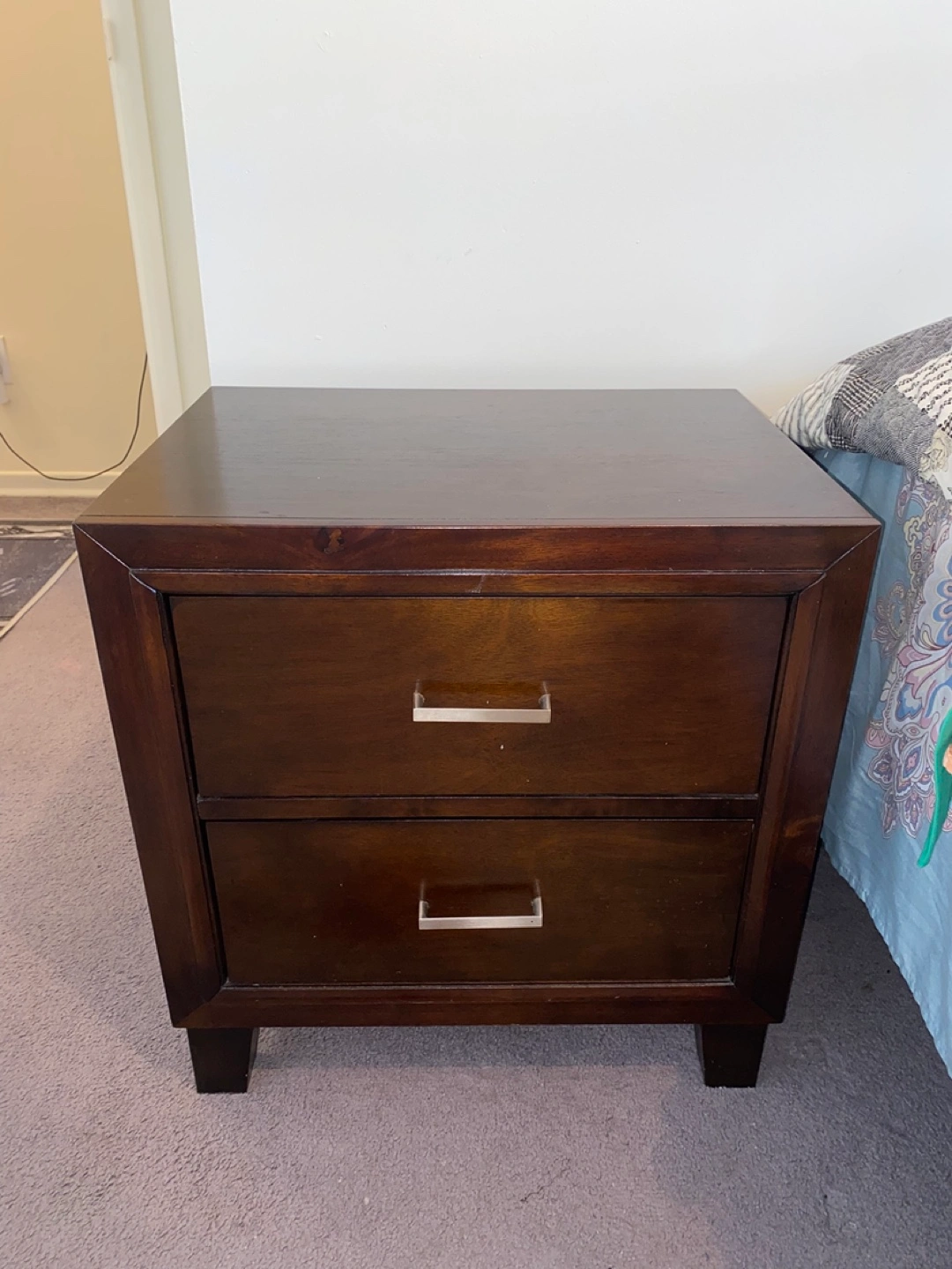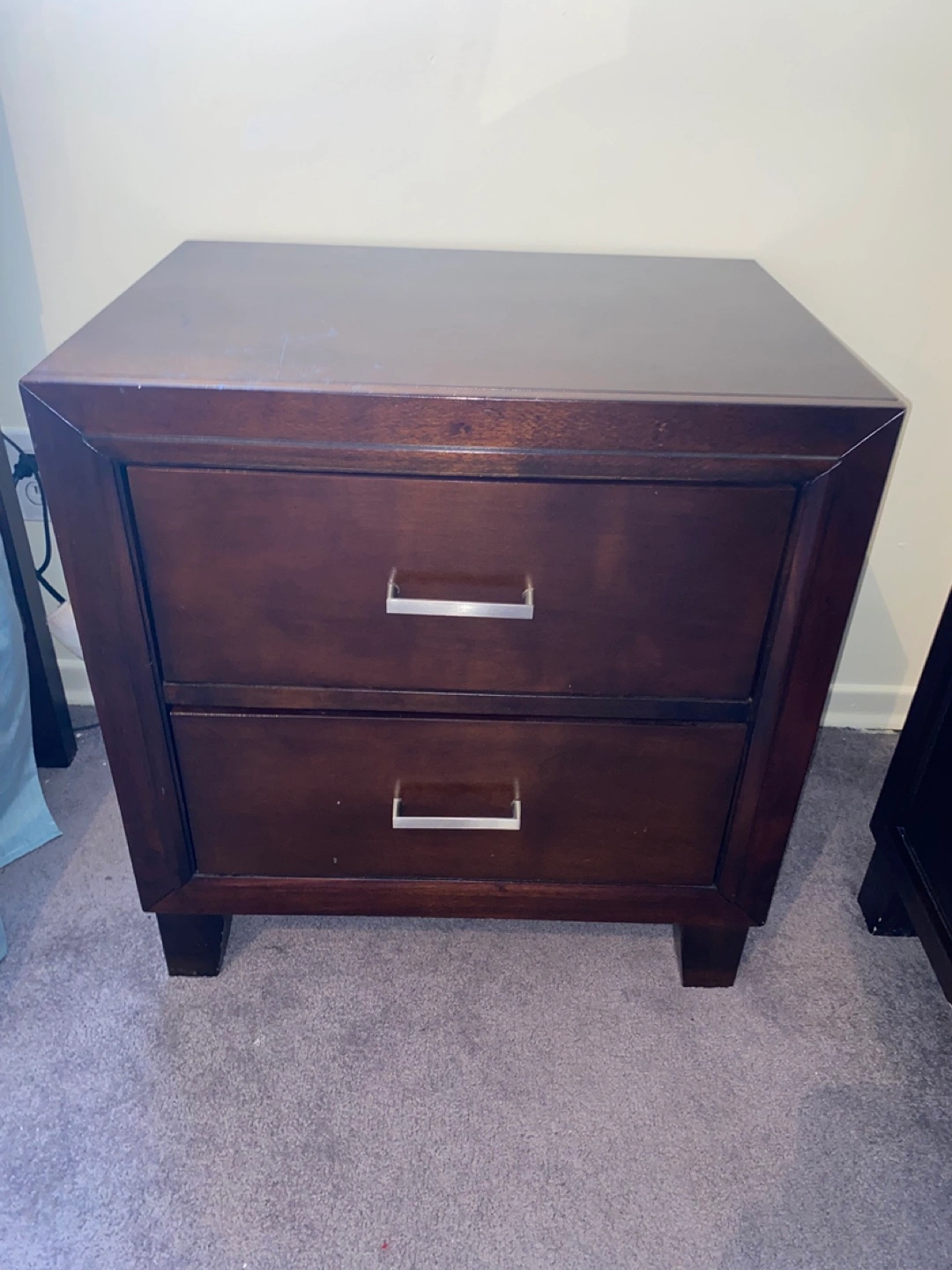 Two-drawer nightstand. Dark brown wood finish. Sleek, modern design. Silver drawer pulls. Good for bedroom storage.