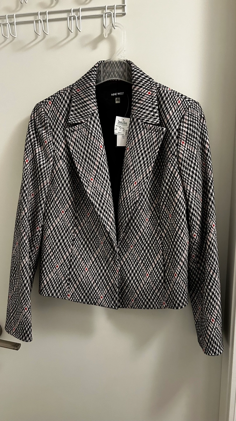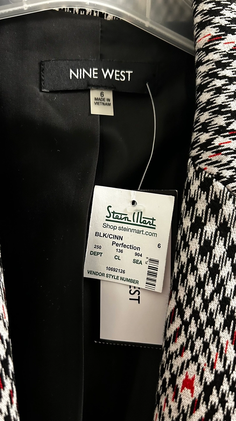 54Nine West women's blazer. Size 6. Black, white, and red houndstooth pattern. Cropped style. Unworn. Made in Vietnam.