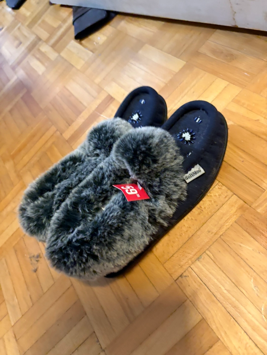 Navy blue moccasin slippers. Features grey faux fur trim. Embellished with small, sparkly details. Soft and cozy. This shoe has never been worn before and the original price was $60. Size 10.5 in women’s