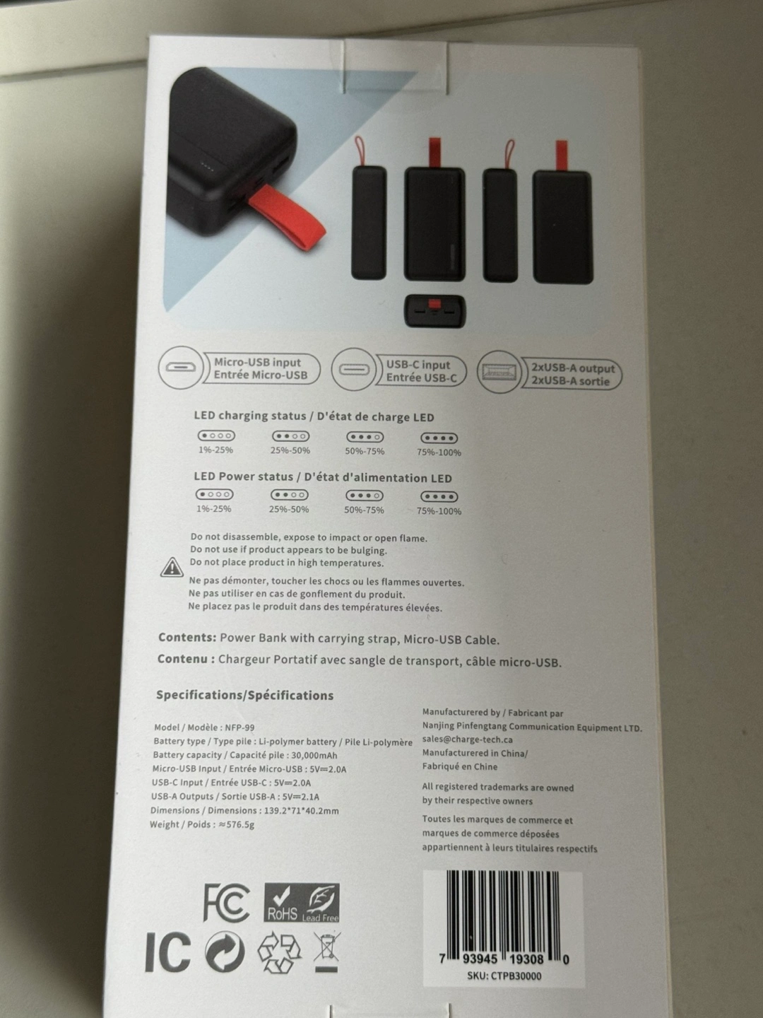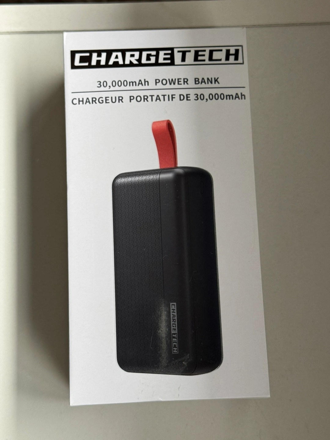 30000mAh portable power bank. LED charging status. Red carrying loop.