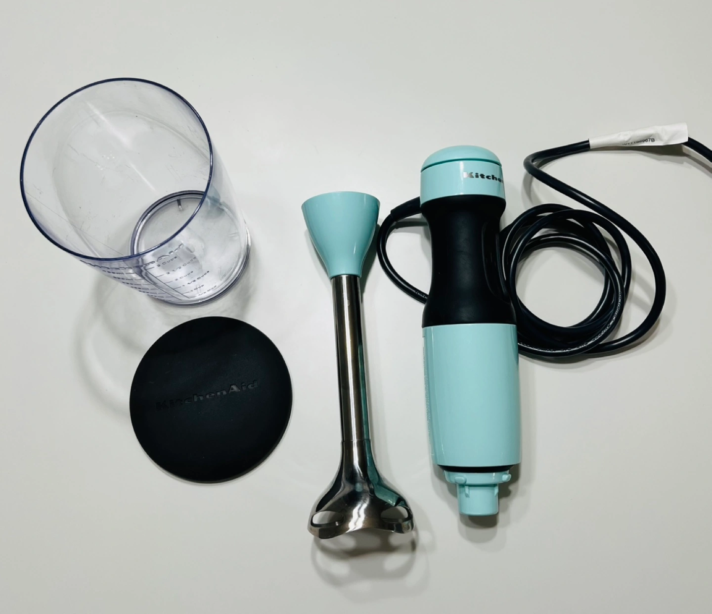 Lightly used KitchenAid cordless hand blender. Includes blending cup and lid. Aqua colour. Great for soups, smoothies, and more.