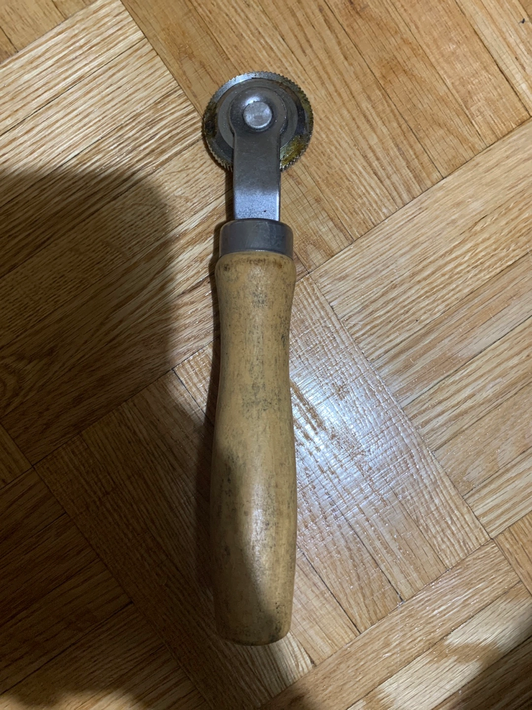 245Used fabric wheel. Wooden handle. Metal roller. Shows some wear.