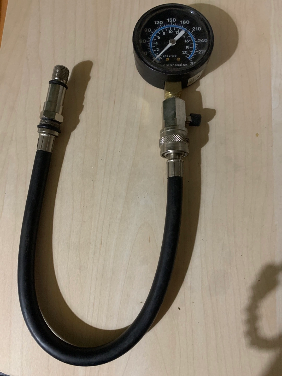 Used compression tester. Features a gauge with a pressure range up to 270 kPa. Includes a flexible hose and fitting.