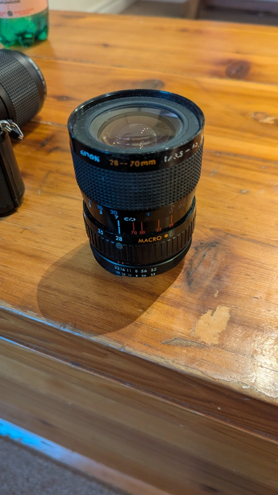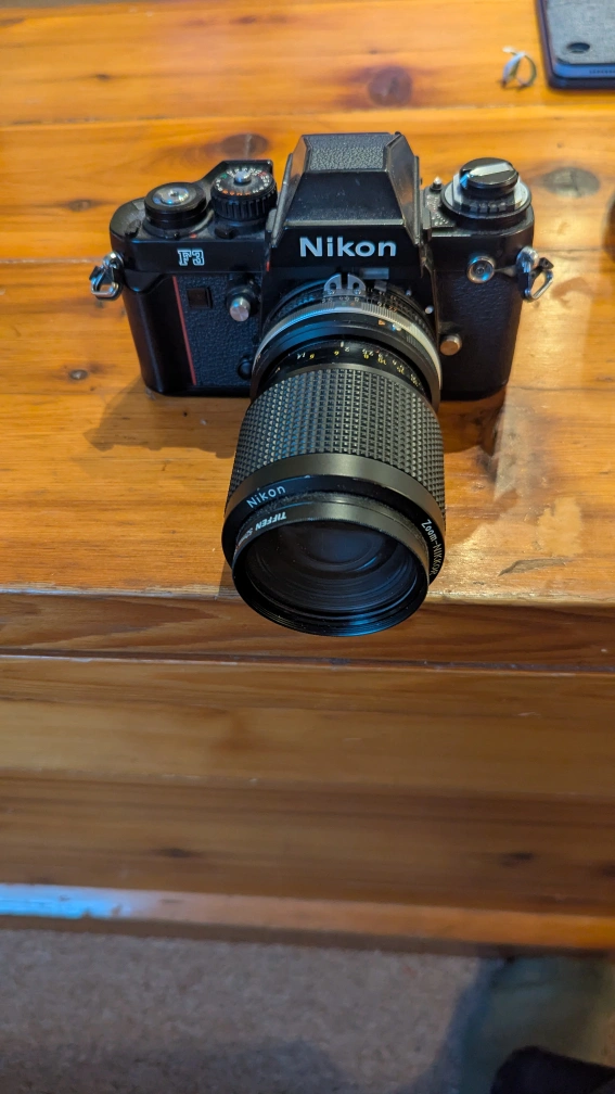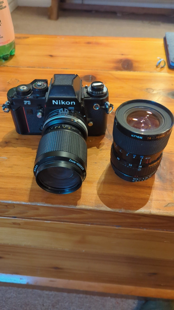 Vintage Nikon F301 35mm film camera. Includes two Nikon lenses: a 35-105mm zoom and a 28-70mm macro. Great for photography enthusiasts. Sold as is.