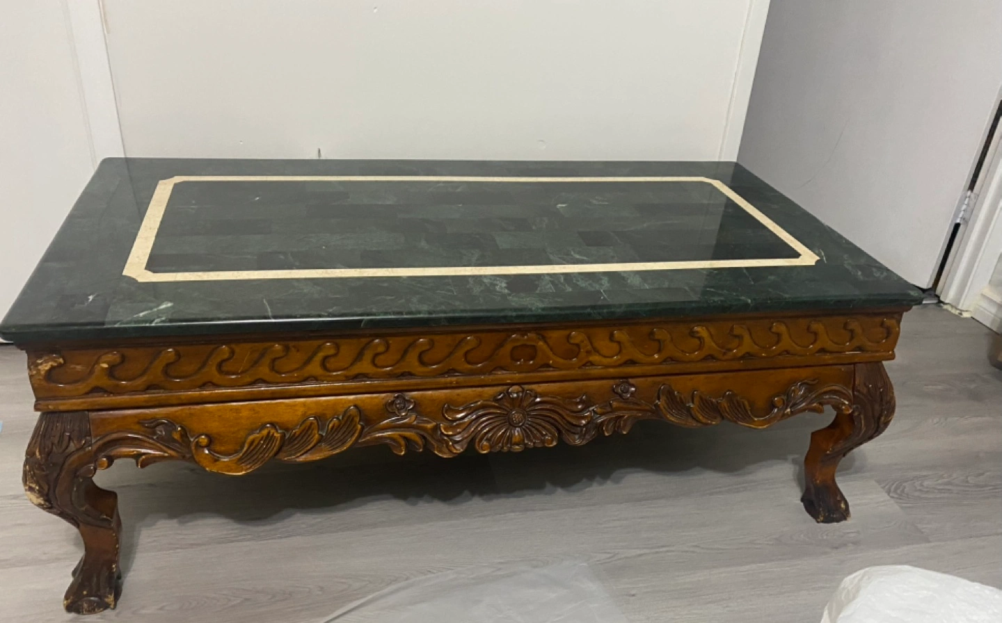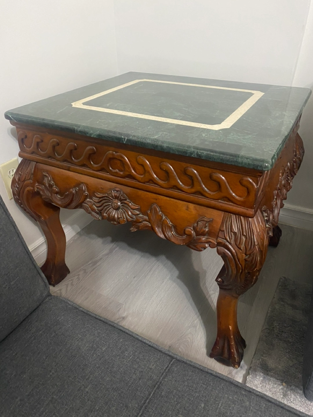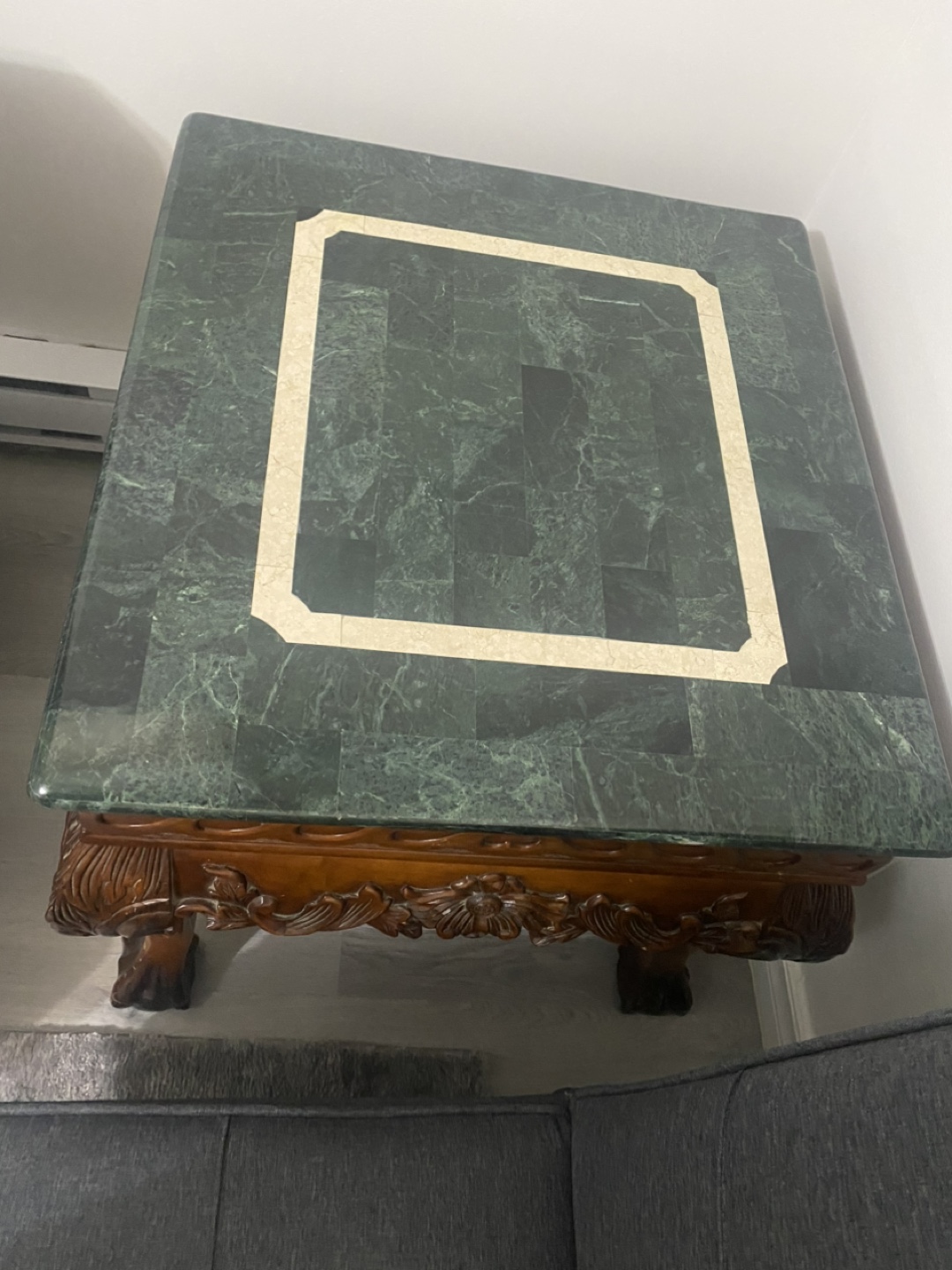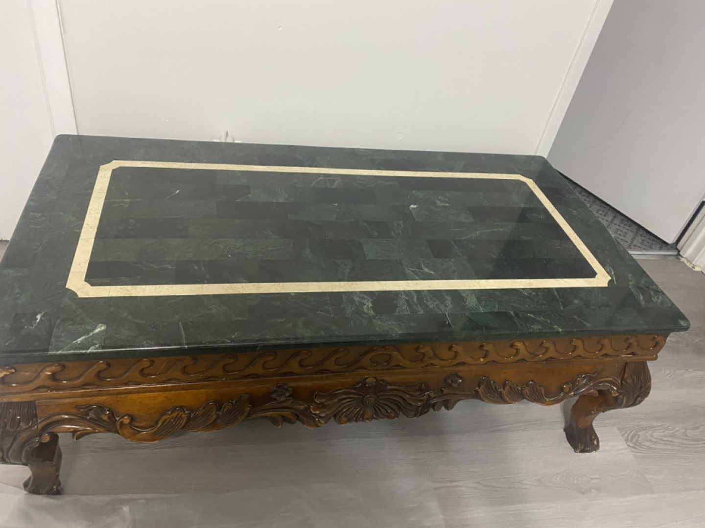 Genuine marble stone top with solid heavy wood. Coffee table with 2 end tables. The coffee table’s measures 50”Lx 26”Wx 17.5” H.