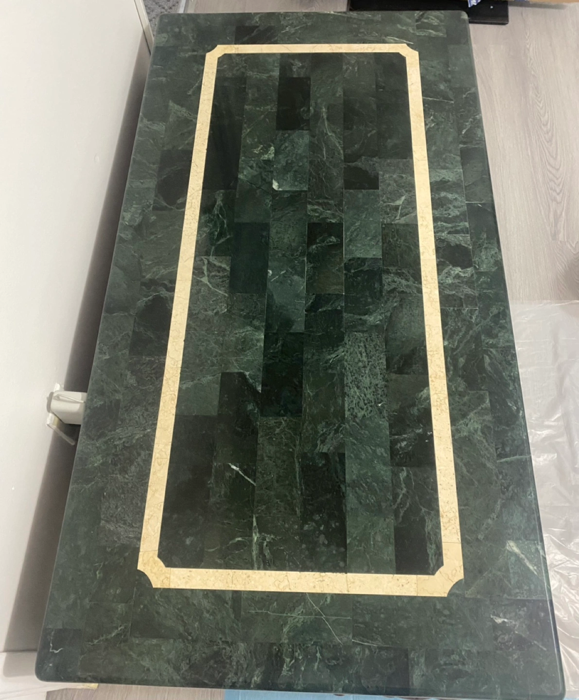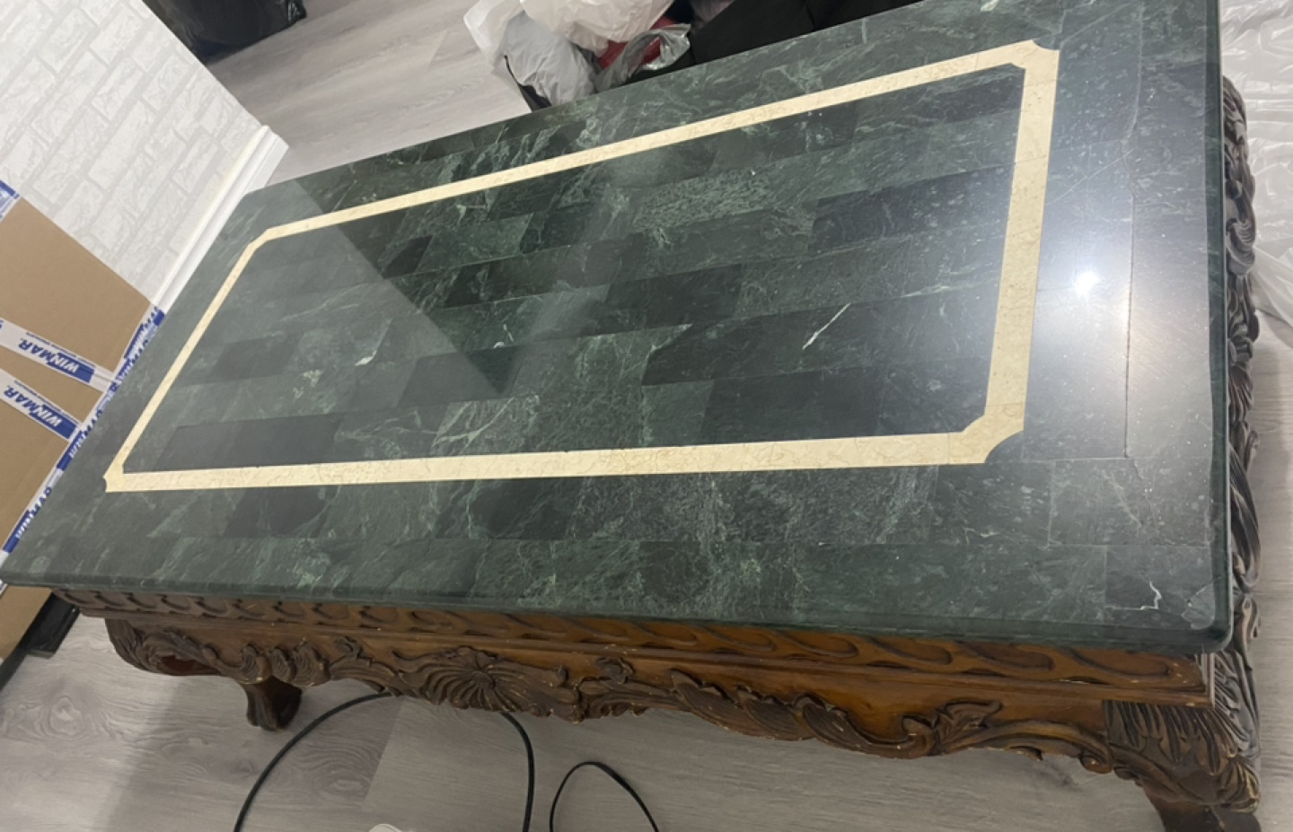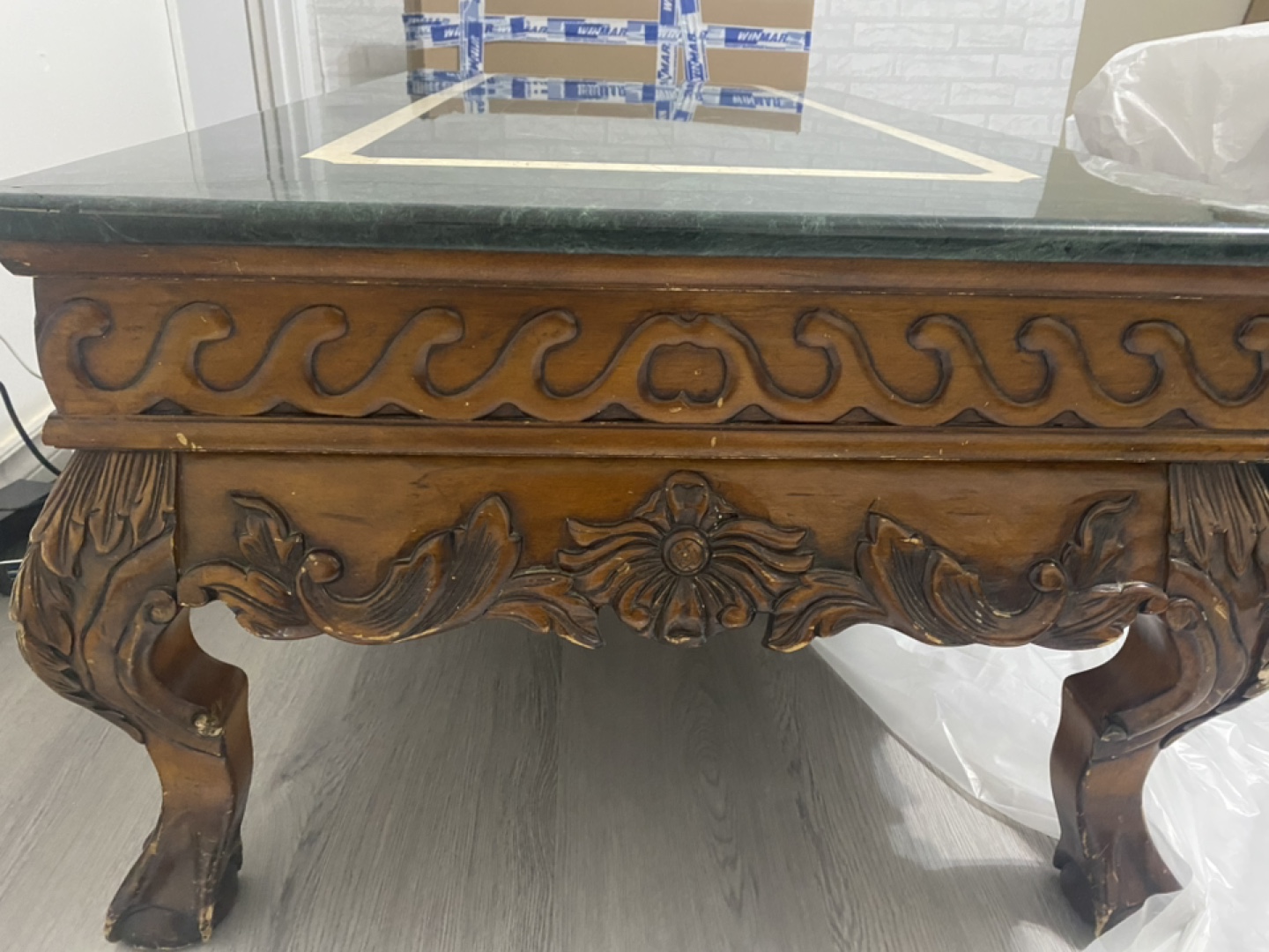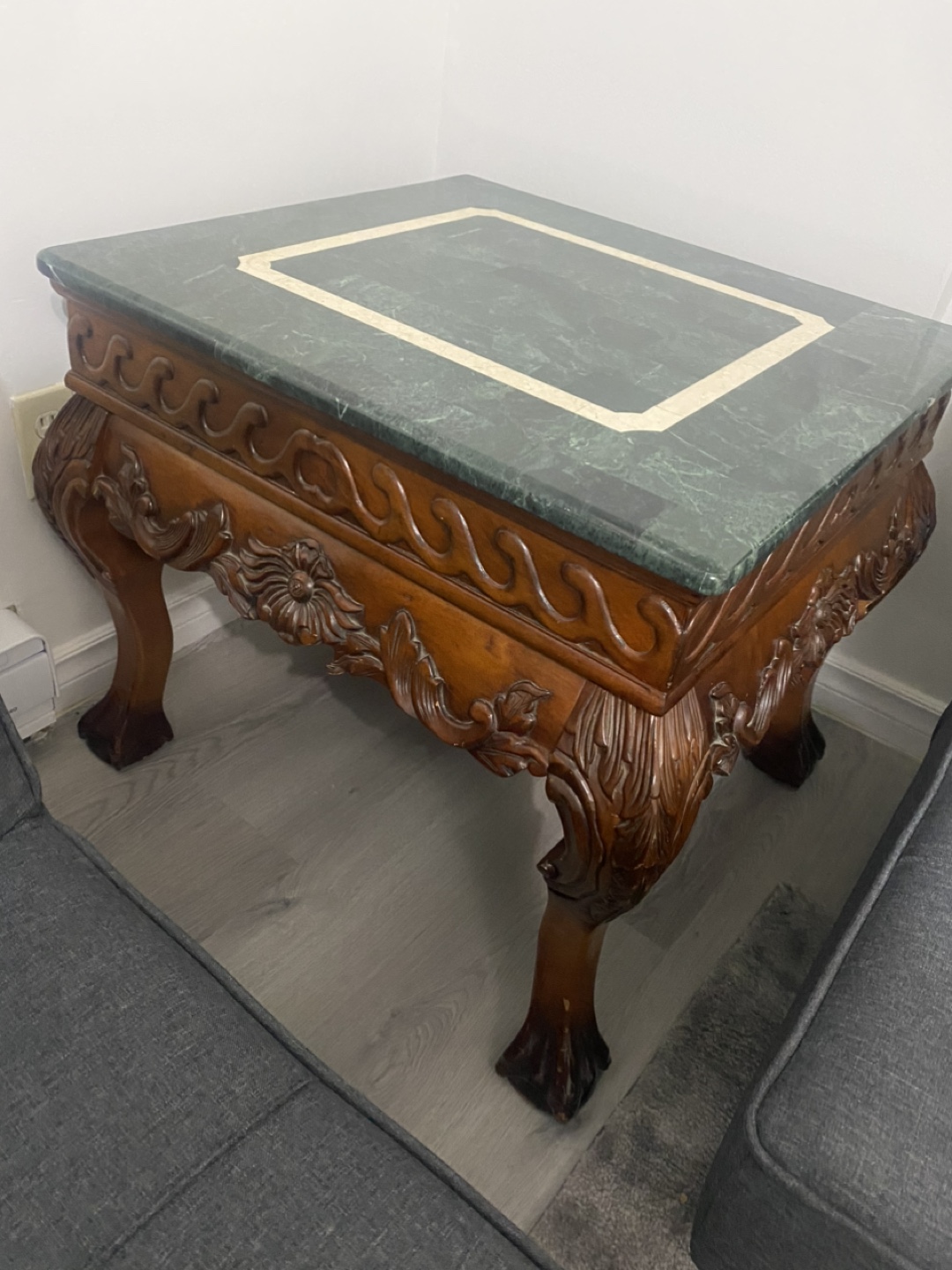 Genuine marble stone top with solid heavy wood. Coffee table with 2 end tables. The coffee table’s measures 50”Lx 26”Wx 17.5” H.