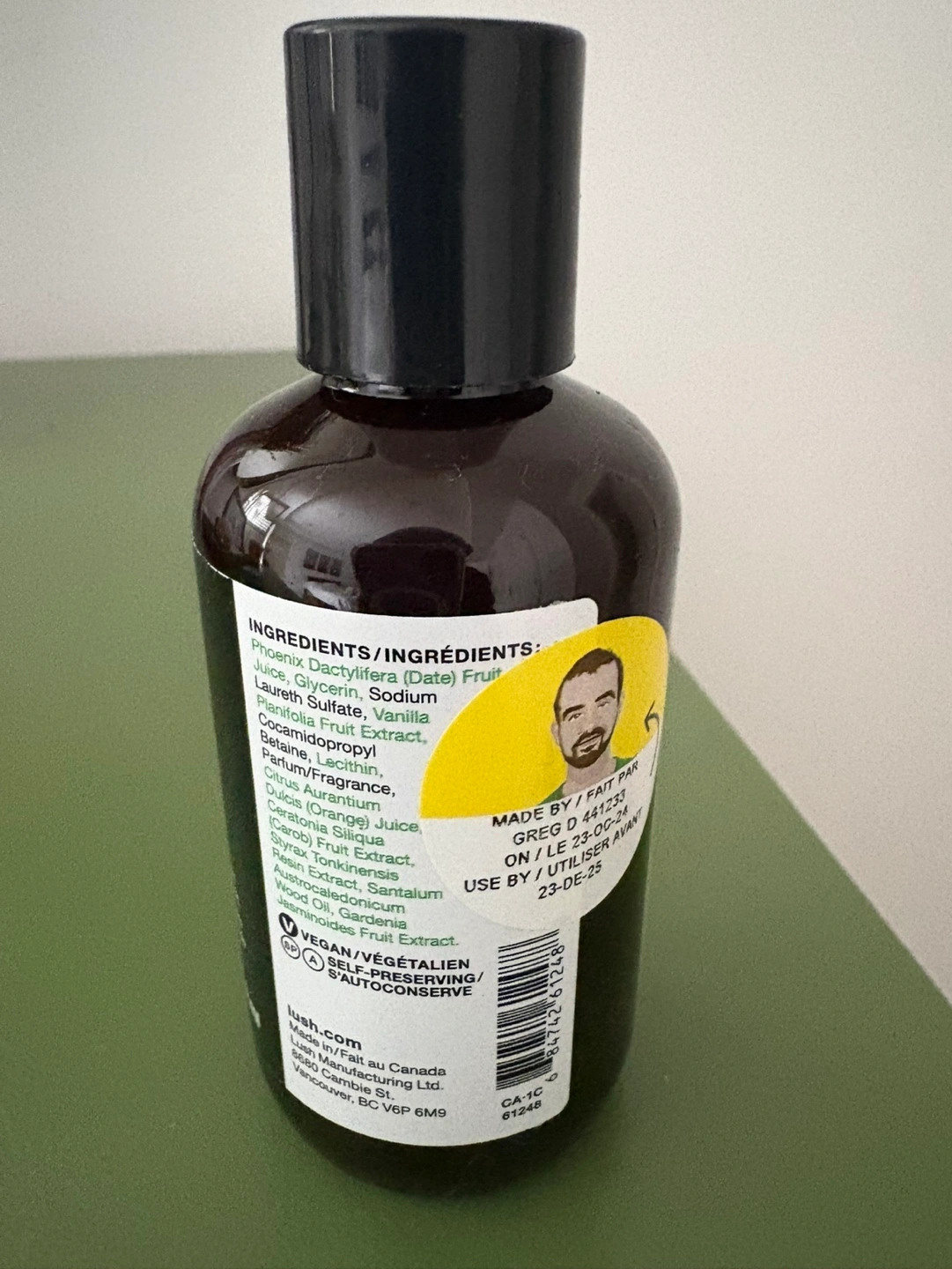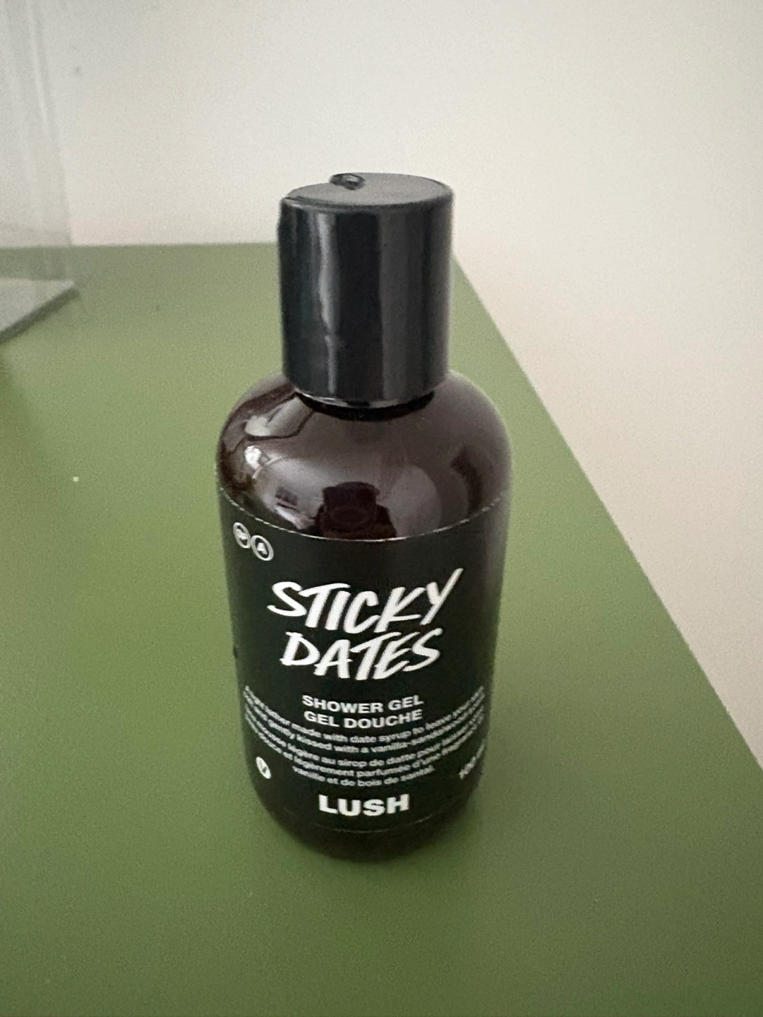 LUSH shower gel. Sticky Dates scent. Dark brown bottle with black cap. Vegan.
