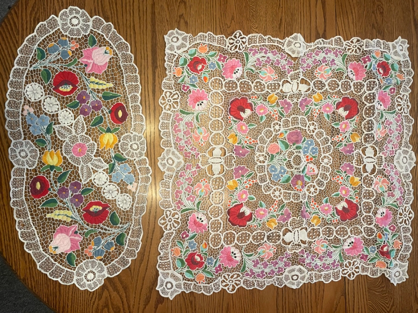 Two beautiful vintage lace doilies. Intricate floral embroidery. Cream coloured lace. Oval and square shapes. Perfect for adding a touch of vintage charm to your home.