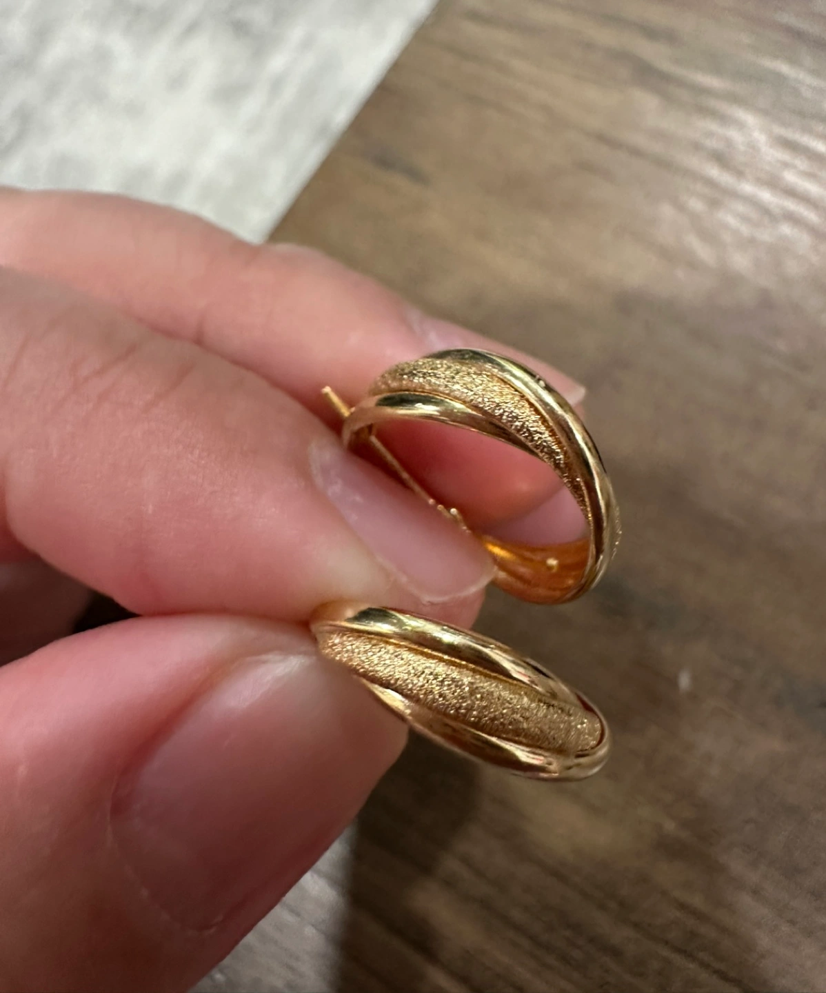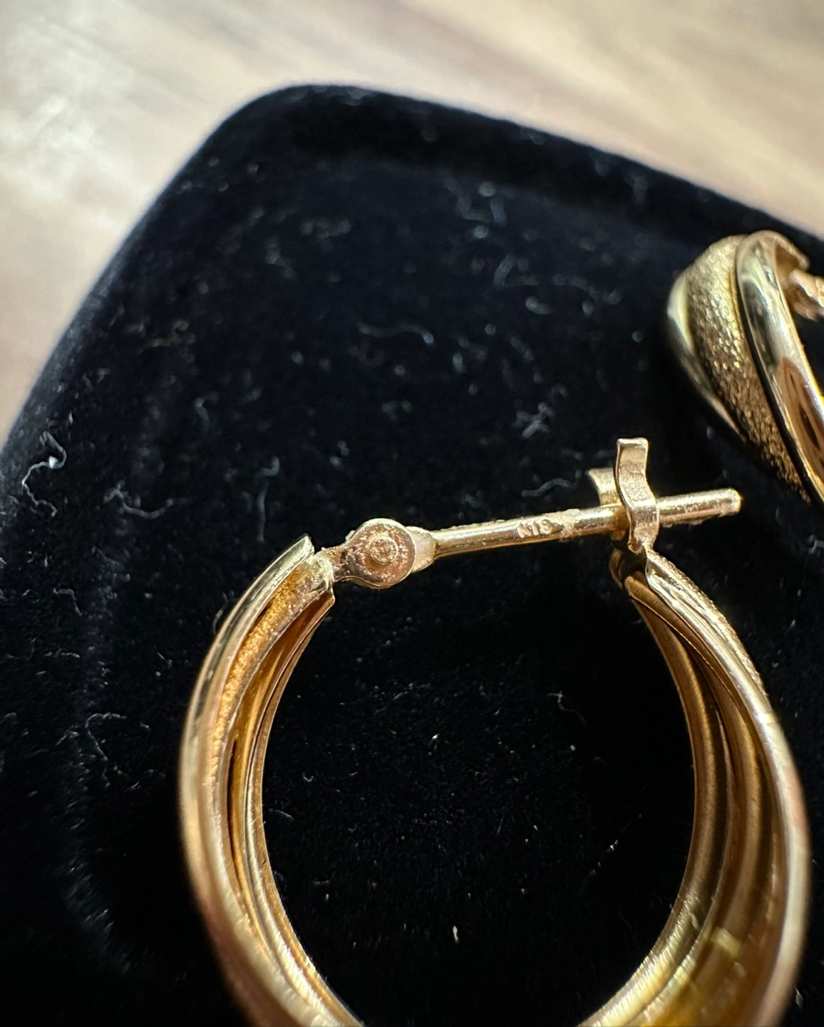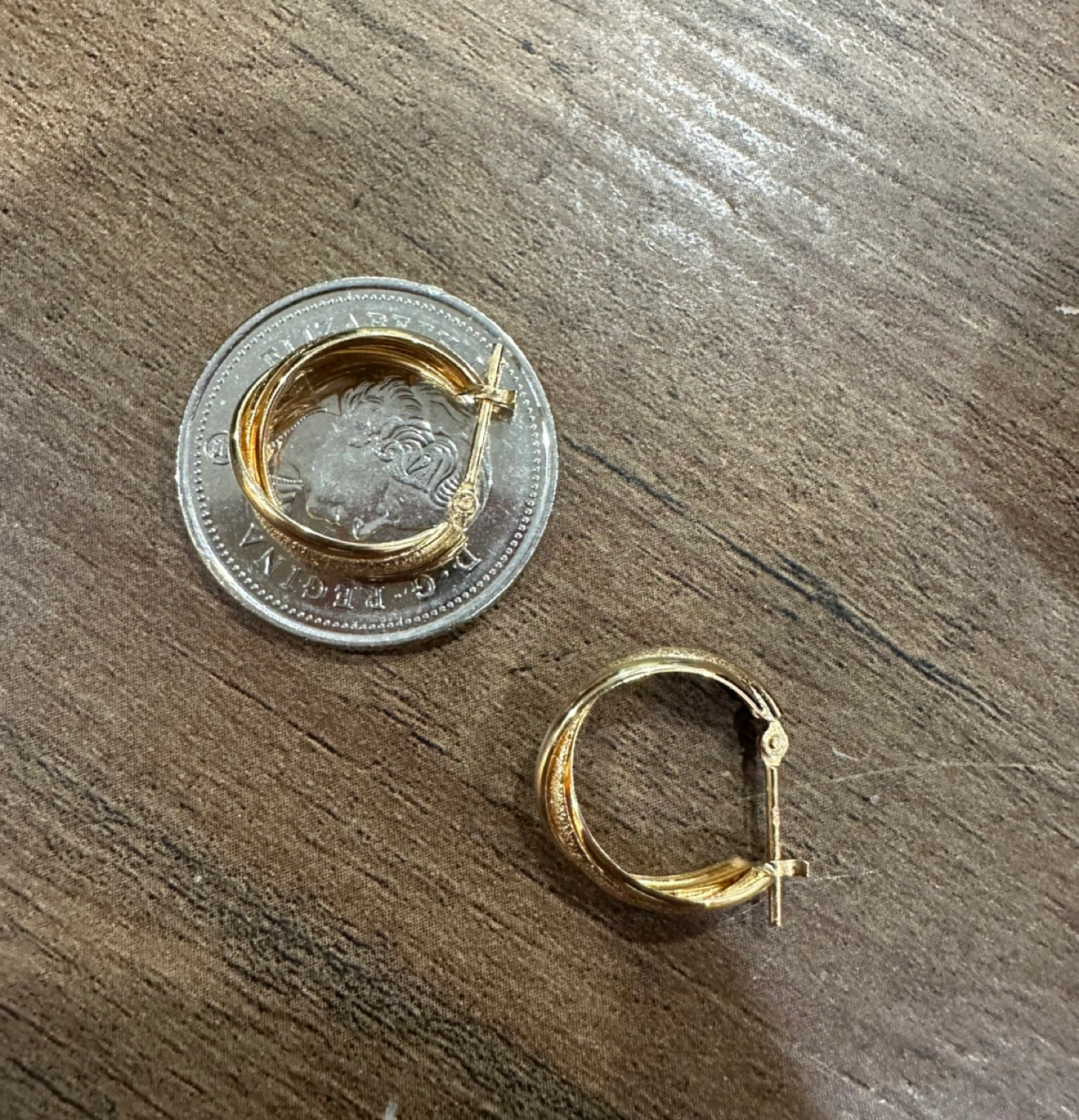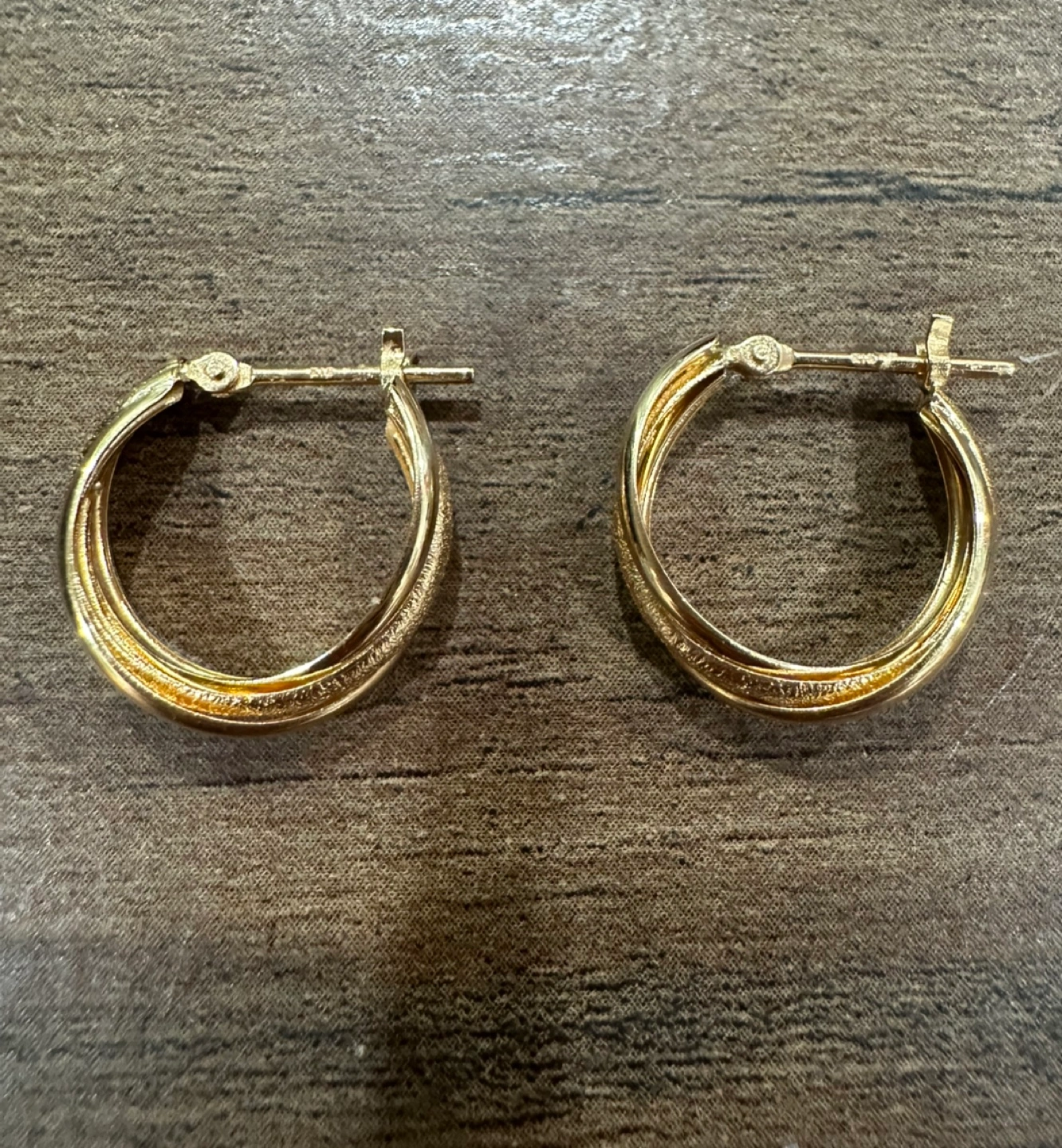 Pure / Solid 18K Yellow Gold Earrings - Hoops, intertwining design. The middle layer has a sparkly matte finish while the rest in yellow gold settings. Japan made, very cute design.