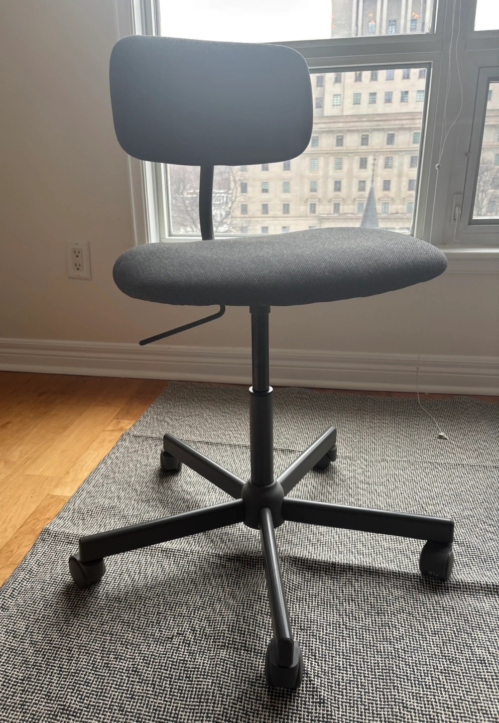 Comfortable office chair, swivels and has adjustable height. Dark grey fabric seat and backrest. Five-star base with smooth rolling casters. Ideal for home or office use. Great condition. Only selling due to moving. Need gone asap. Original price before tax: $189 Brand: BLECKBERGET Color: Idekulla dark grey