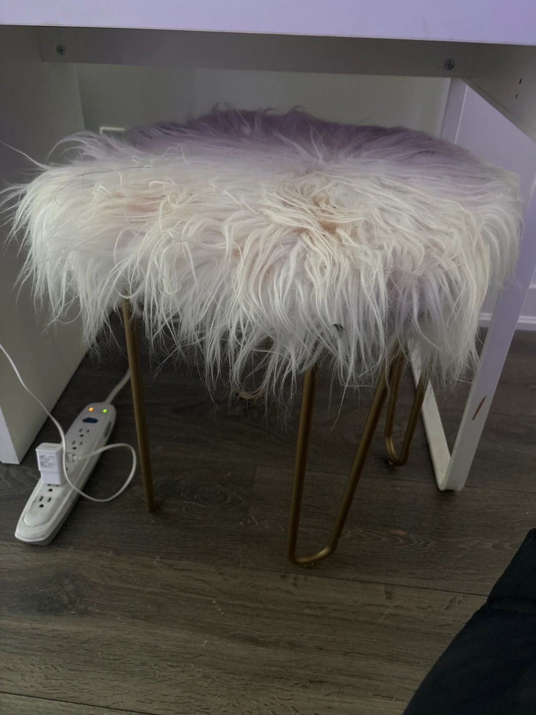 Round fluffy stool. Purple and white ombre faux fur top. Gold hairpin legs. Perfect for a vanity or bedroom.