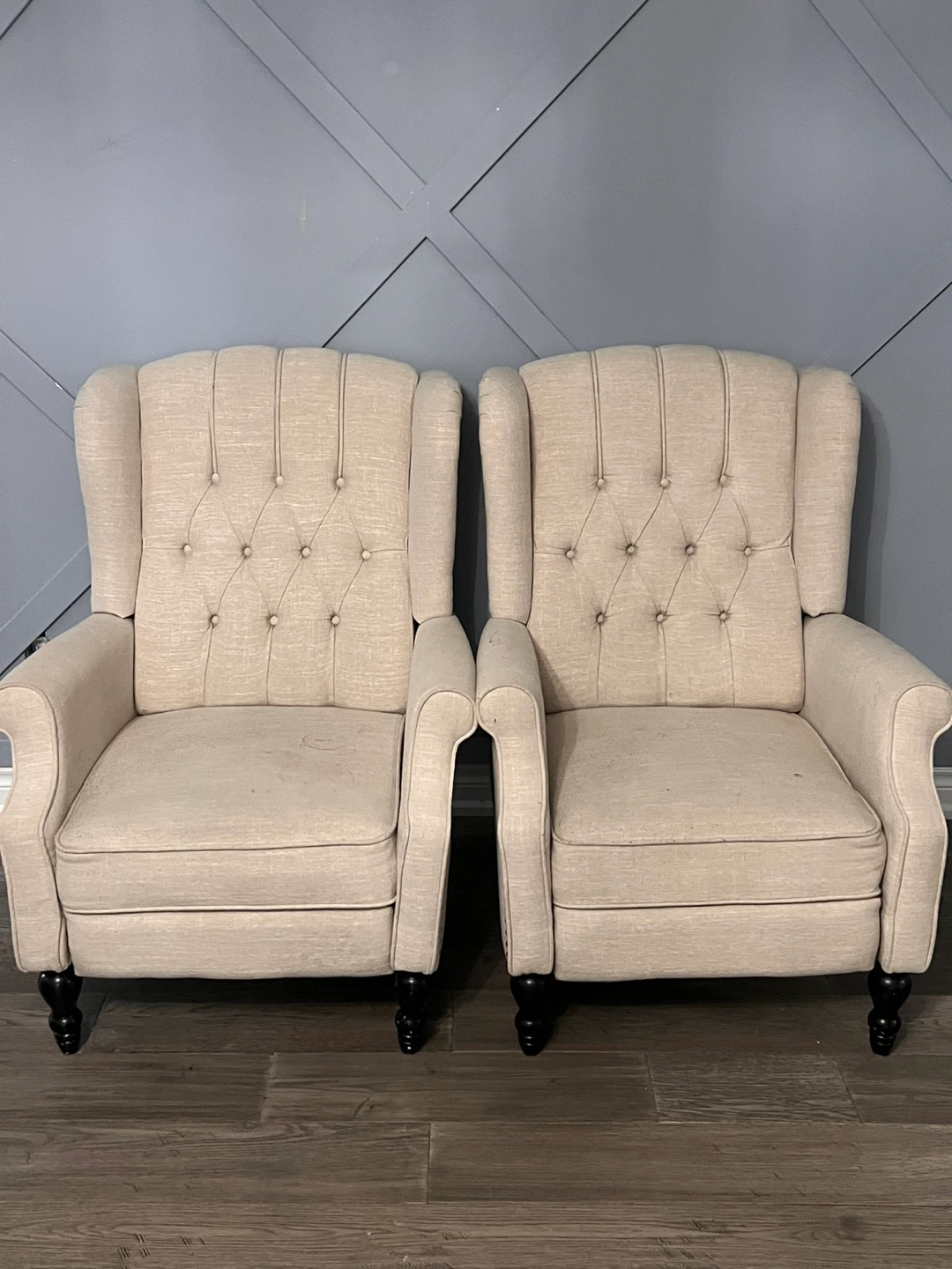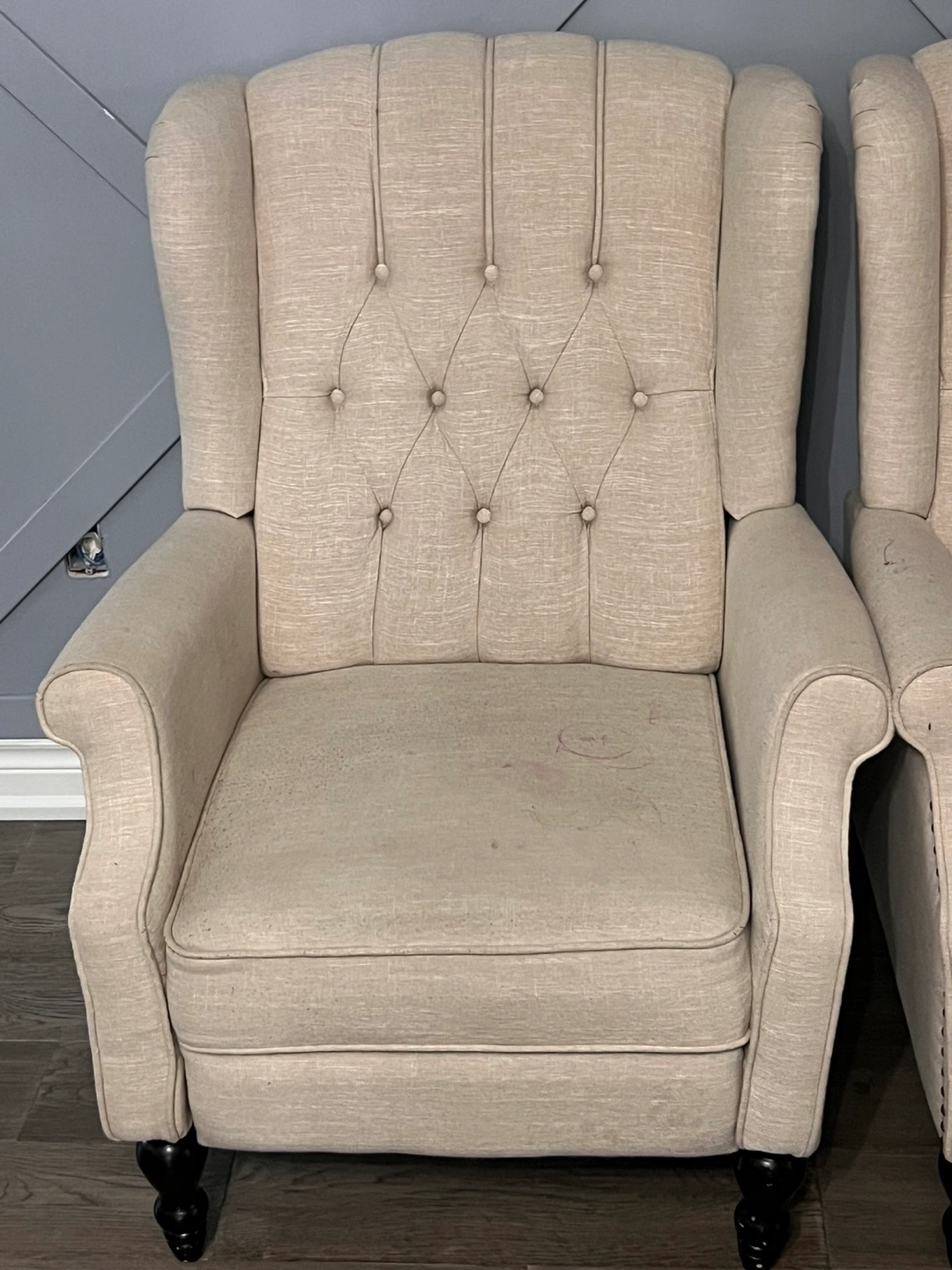 Two beige fabric recliners. Wingback style. Button tufting. Dark brown wooden legs. Some minor stains which can be removed.