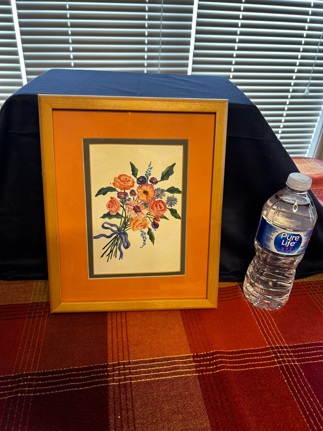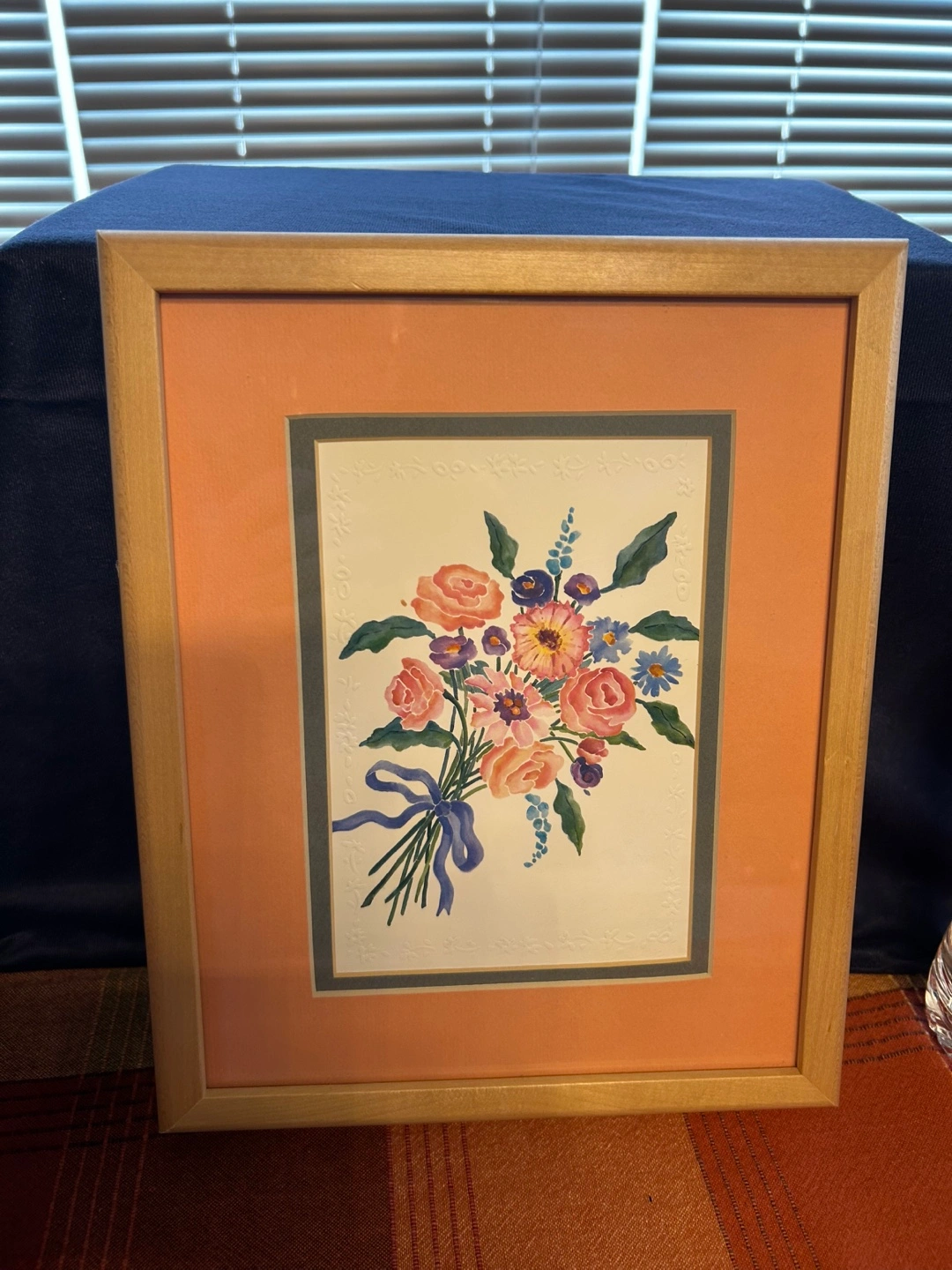 Pretty framed floral print. Wood frame. Perfect for adding a touch of colour to your home décor. Features a watercolour-style bouquet of flowers tied with a ribbon.