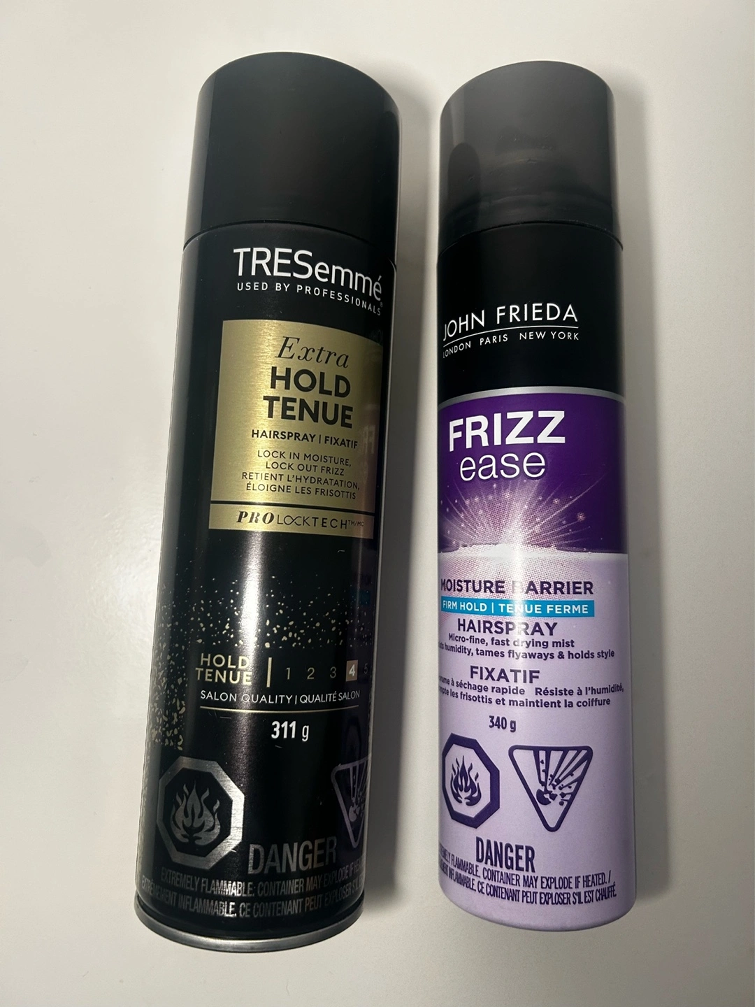 Two hairsprays. Tresemme extra hold, 311g. John Frieda Frizz Ease, 340g. Both are new. Only used once.