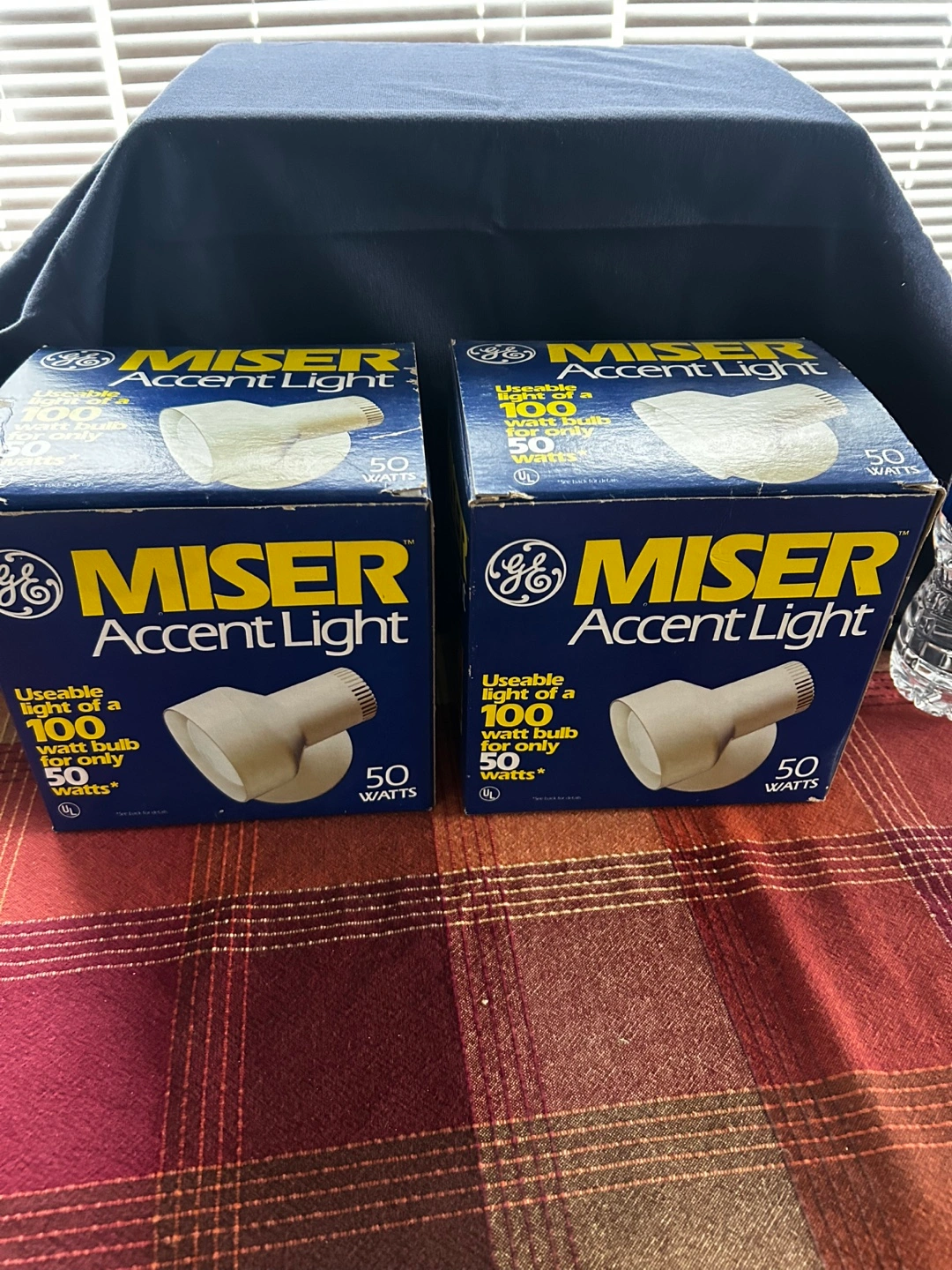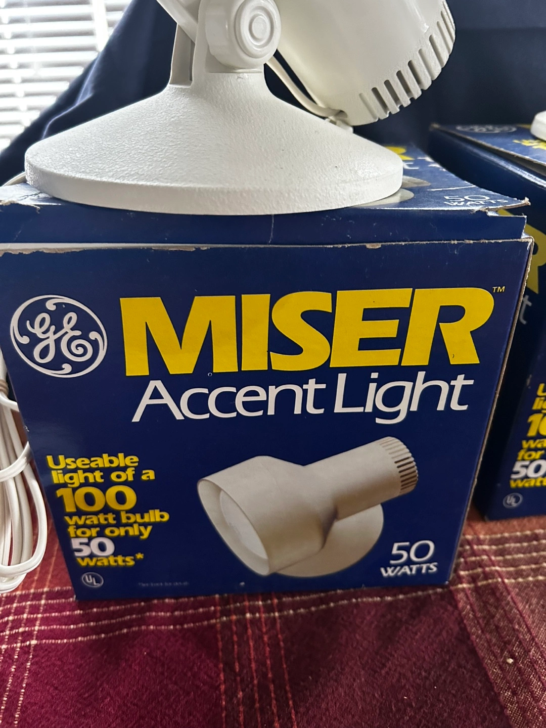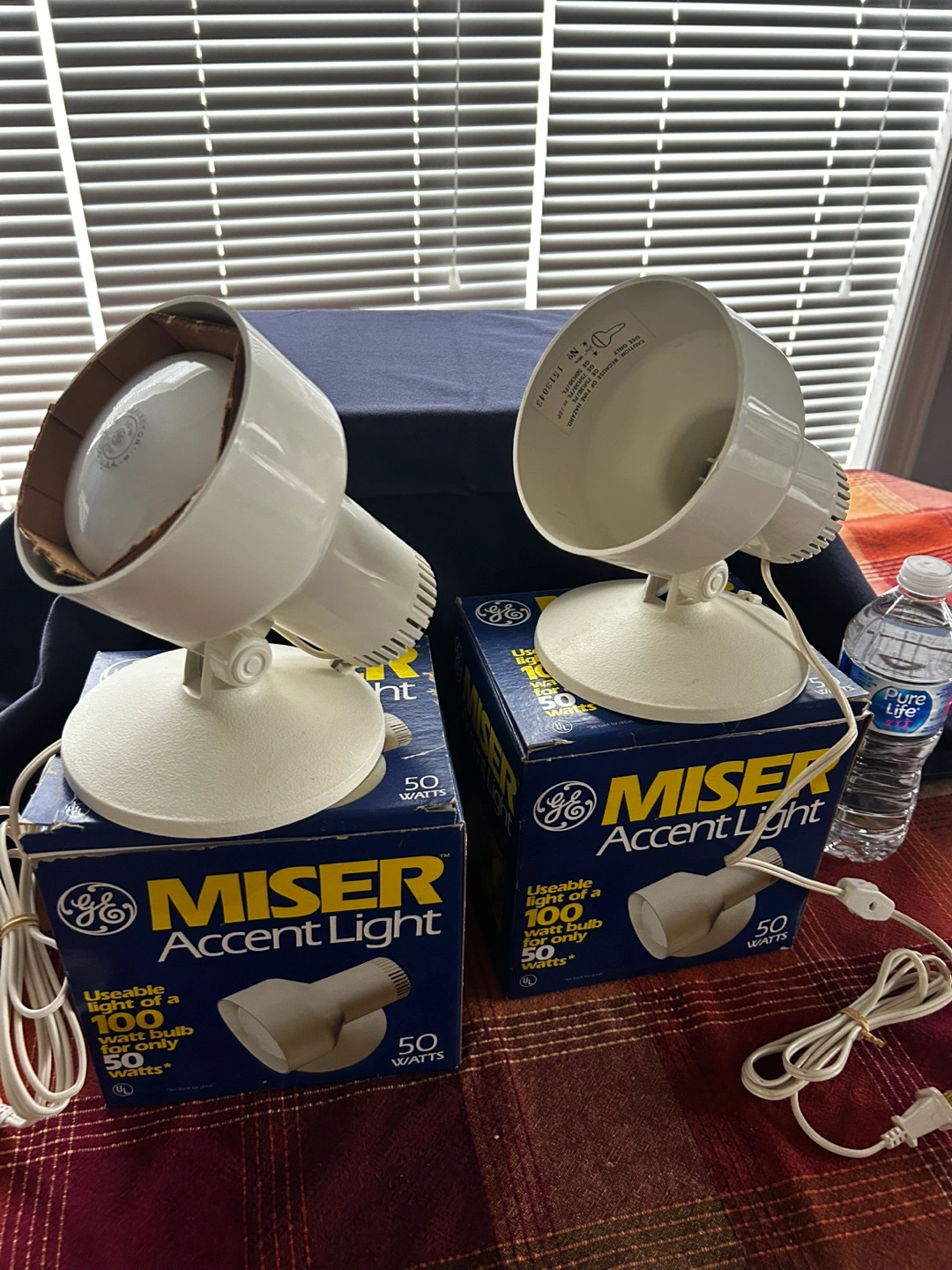 Pair of vintage General Electric Miser Accent Lights. 50-watt floodlights. In original boxes. Great for reading or task lighting.