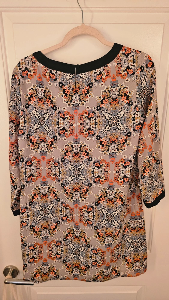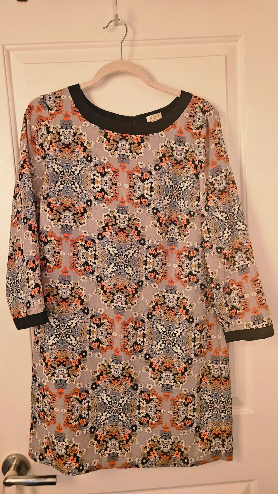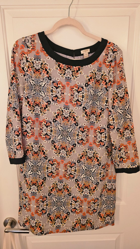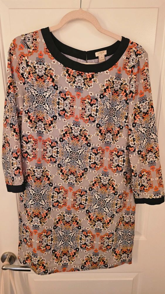 Gorgeous J.Crew shift dress. Size 8. Three-quarter sleeves. Floral print on grey background. Black neckline trim.