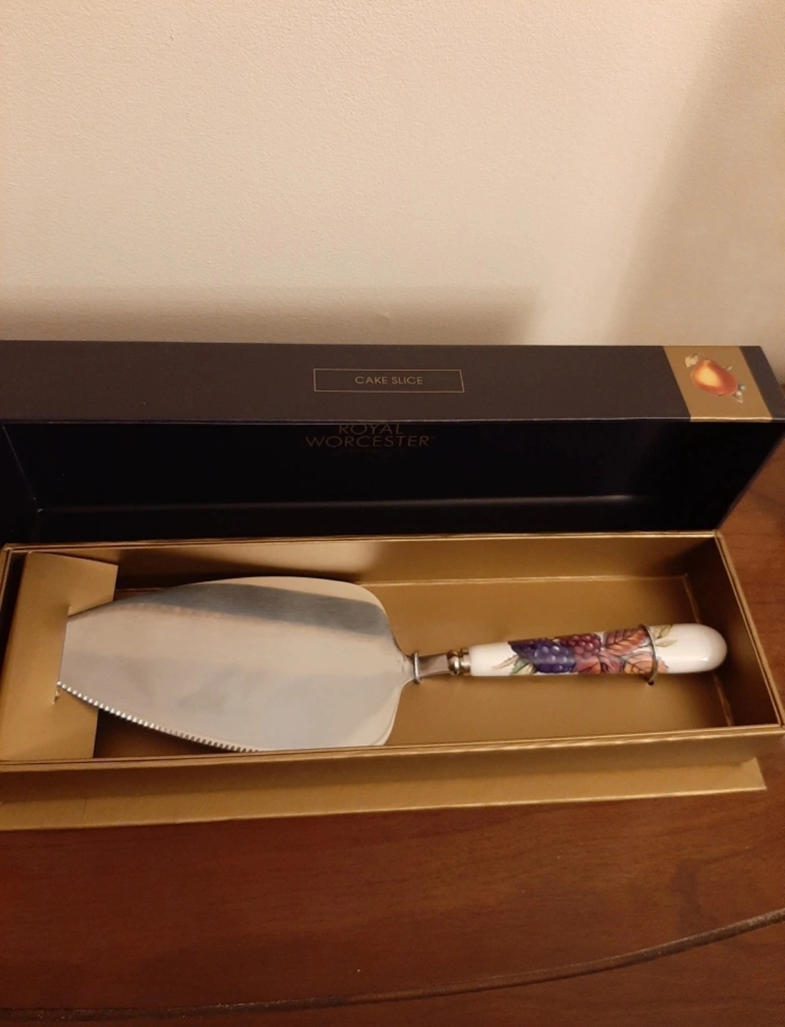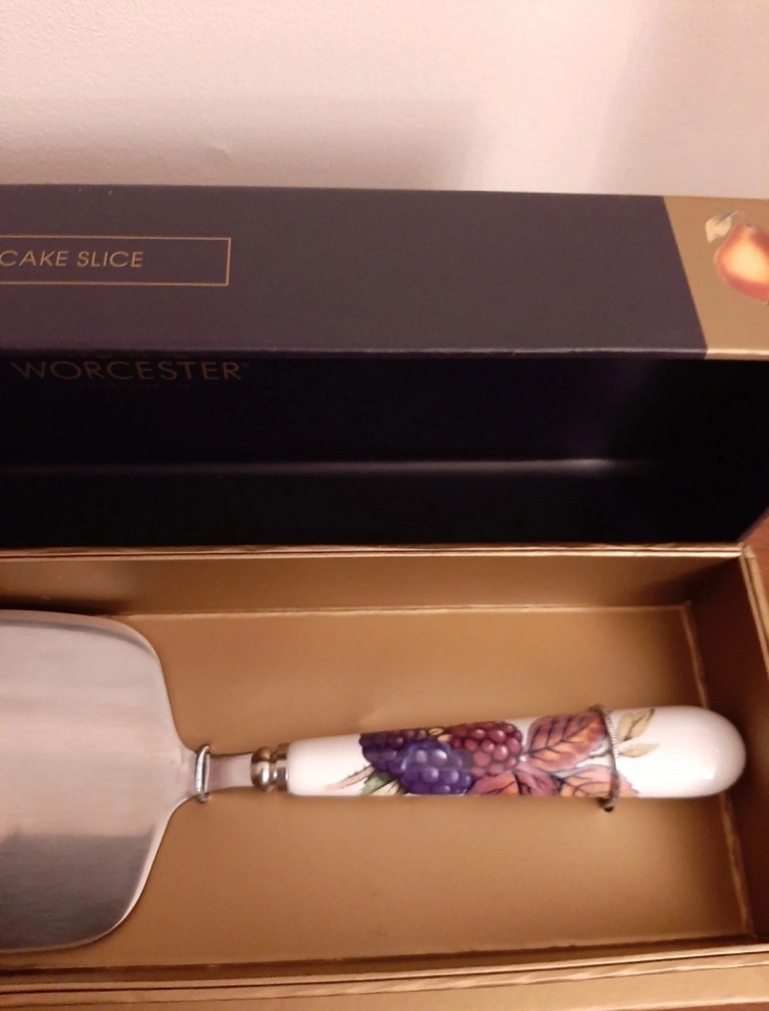 1000+Royal Worcester Evesham Gold cake slice server. Bone china handle with fruit pattern. New, still in box. Available for pickup in Markland Wood.