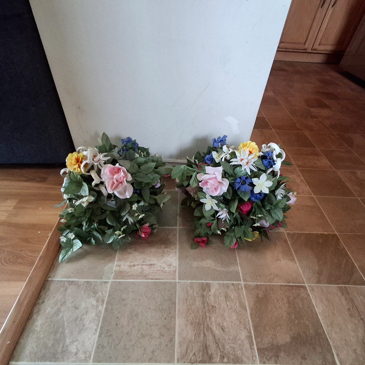2 Vintage hanging Artificial Flower baskets