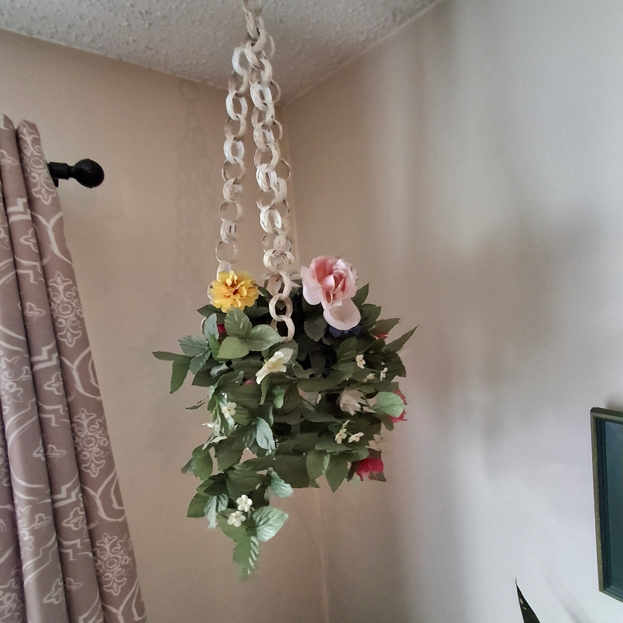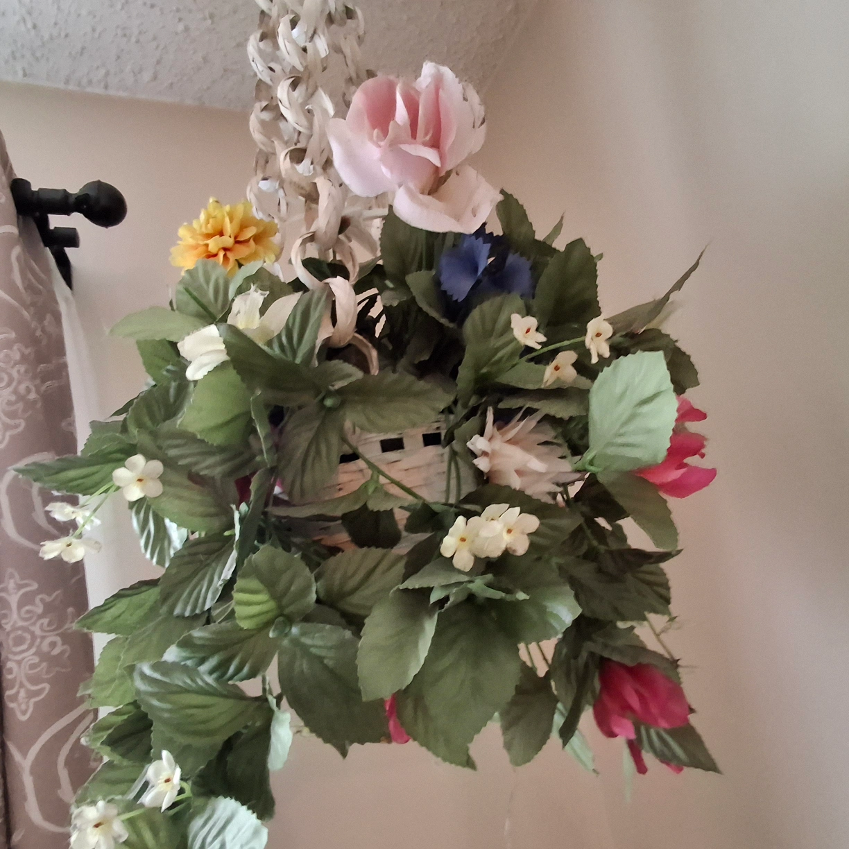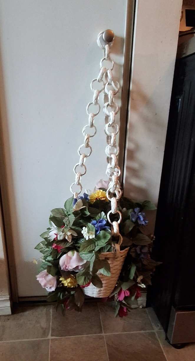 Charming vintage hanging planter. Features a white woven basket and artificial flower arrangement. White chain for hanging. Ideal for adding a touch of vintage charm to your home decor. Two available.