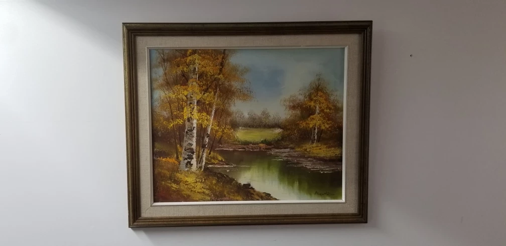 Beautiful autumn landscape painting. Features trees reflecting in a calm body of water. Presented in a simple gold frame. Artist signature visible.