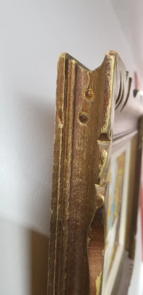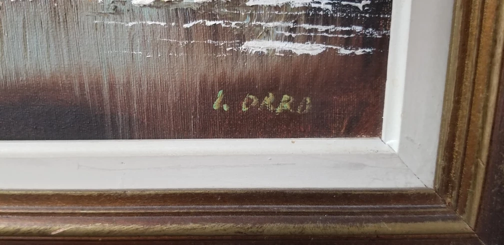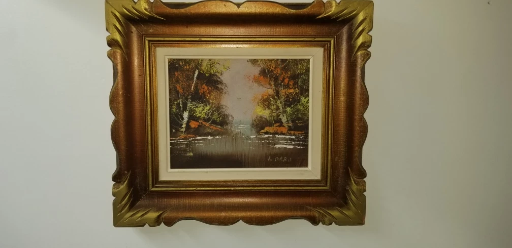 Small framed painting. Ornate gold frame. Landscape scene. Artist signature visible.