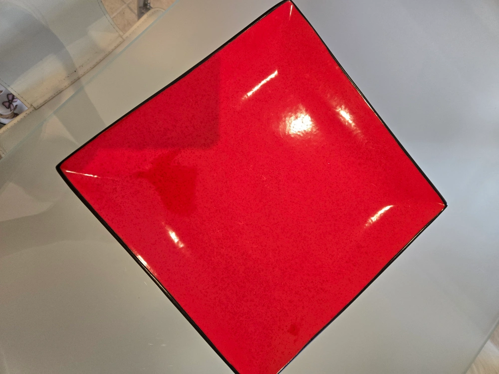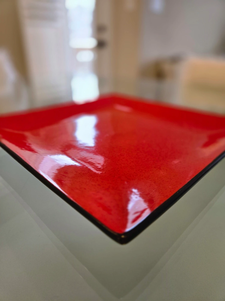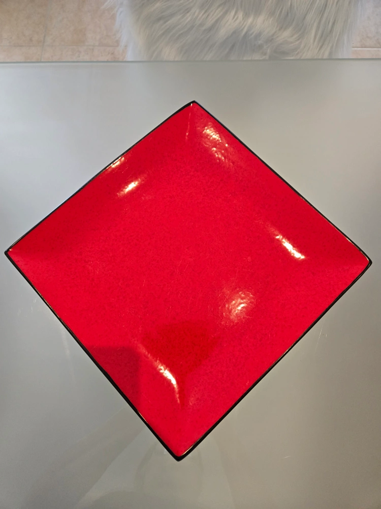 Square Ceramic dinner plate. Red colour with black rim. Microwave and dishwasher safe.