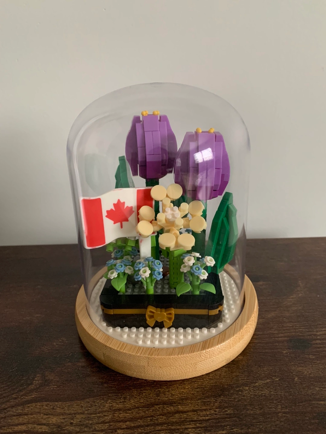 322Cute Lego-style miniature flower arrangement. Features purple tulips, forget-me-nots, and a Canadian flag. Wooden base. Glass dome cover. Perfect gift or home décor.