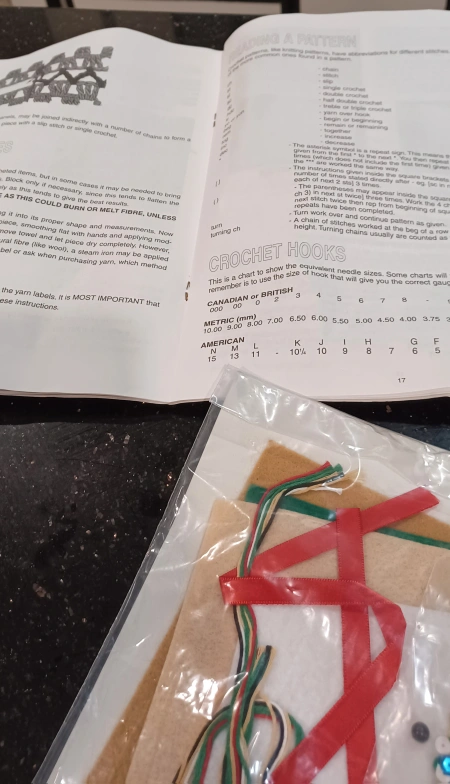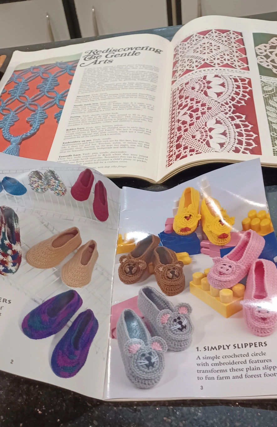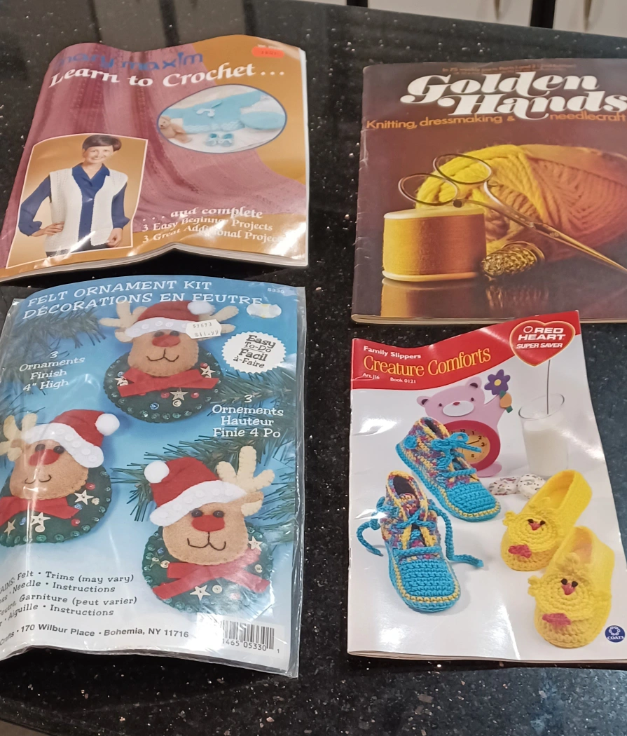Collection of vintage crochet and knitting pattern books and kits. Includes patterns for various projects, such as slippers, ornaments, and more. Some books are from Golden Hands and Mary Maxim. Great for crafters and collectors.