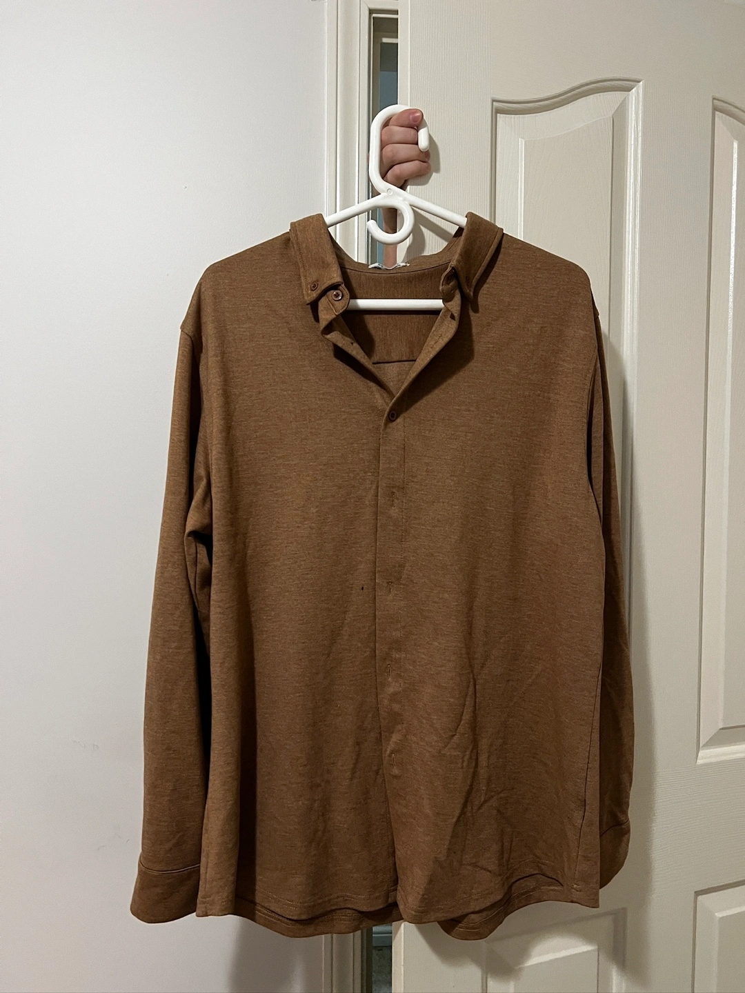 Men's long-sleeve button-down shirt. Comfortable material.Brown colour. Size large. New, wore only once