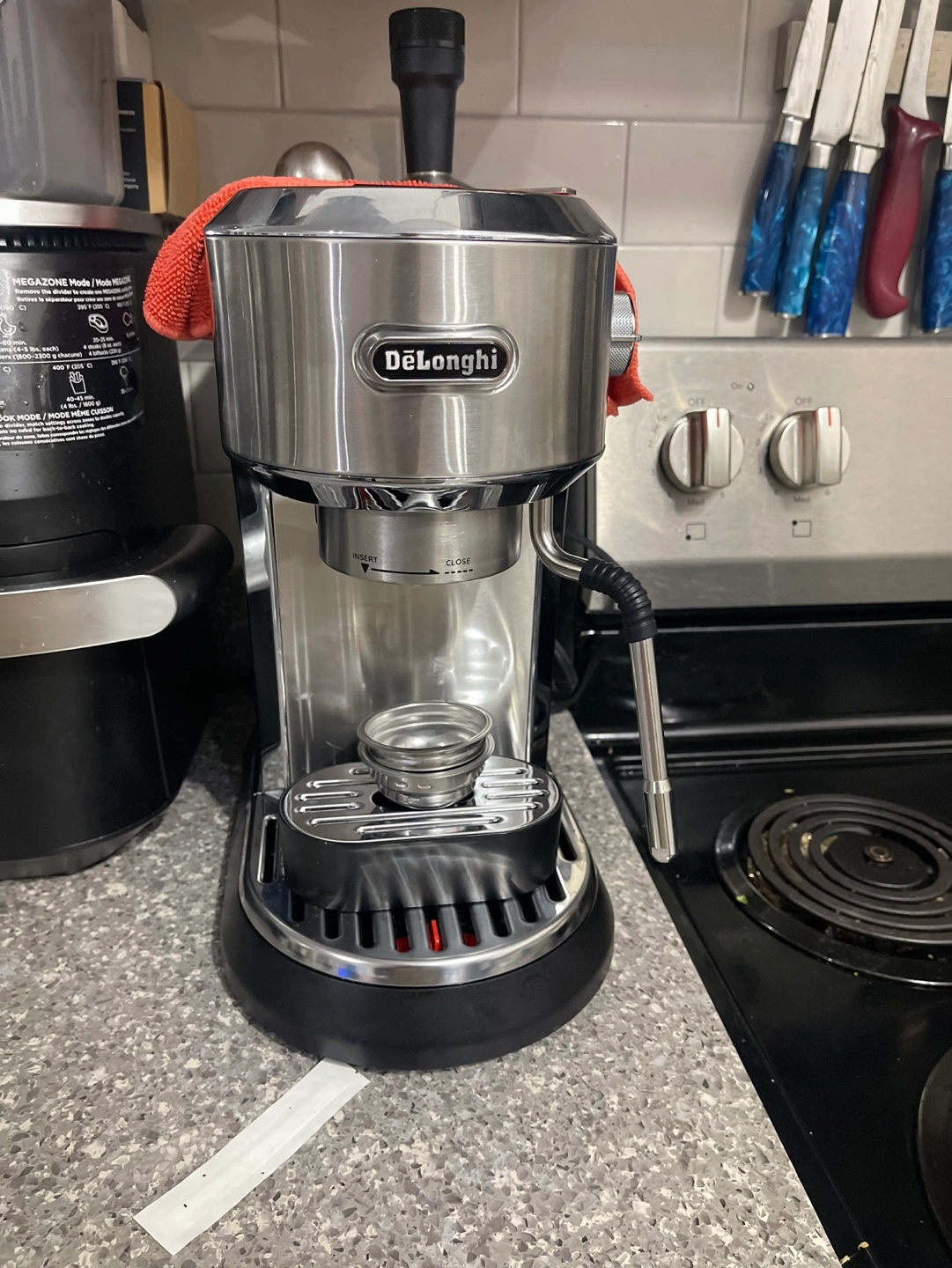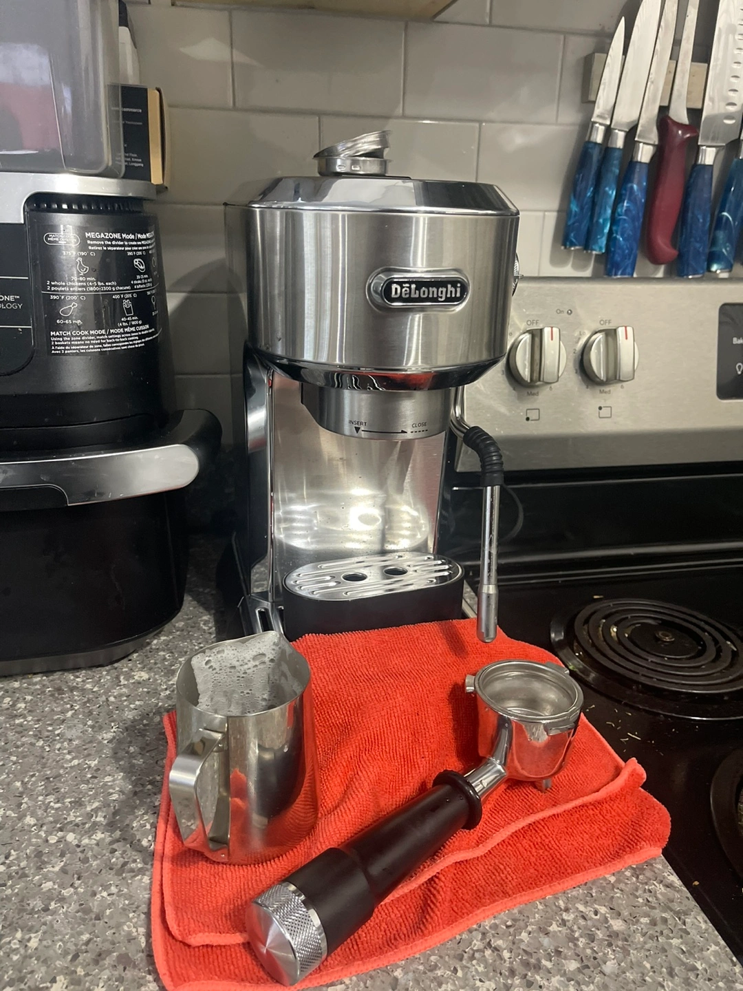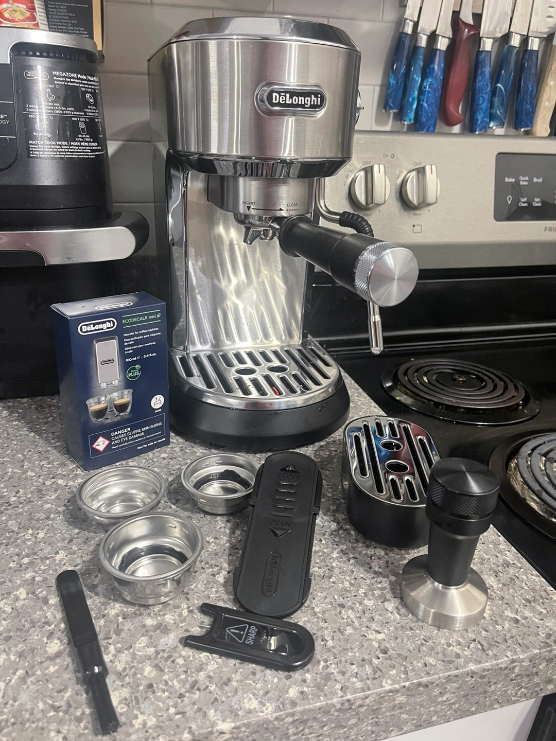 Stainless steel espresso machine. Includes portafilter, tamper, and cleaning accessories. Excellent for making espresso at home. Compact design.