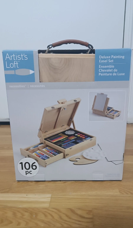106-piece painting set. Wooden easel with storage drawers. Includes paints, pencils, and other art supplies. Perfect for artists of all levels.