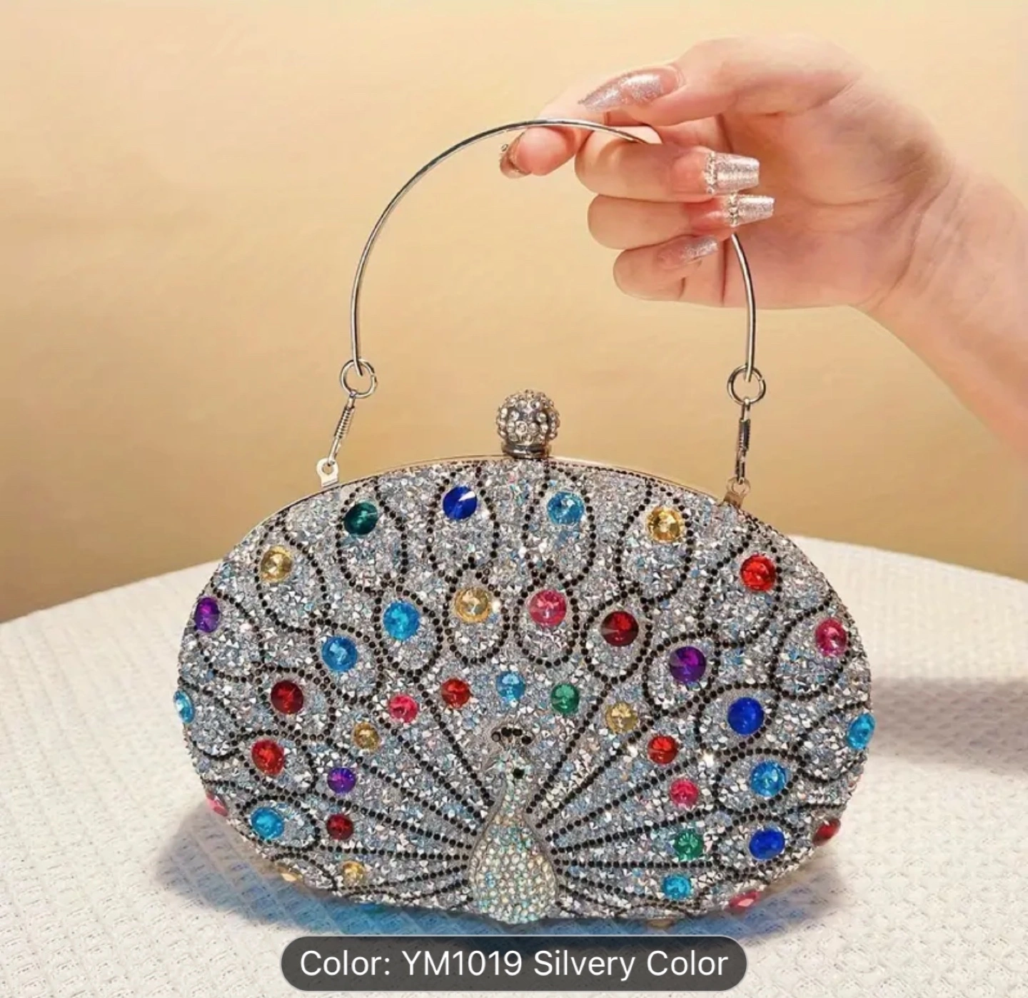 Gorgeous jeweled clutch. Oval shape. Features a peacock design. Perfect for special occasions. Multiple colour options.