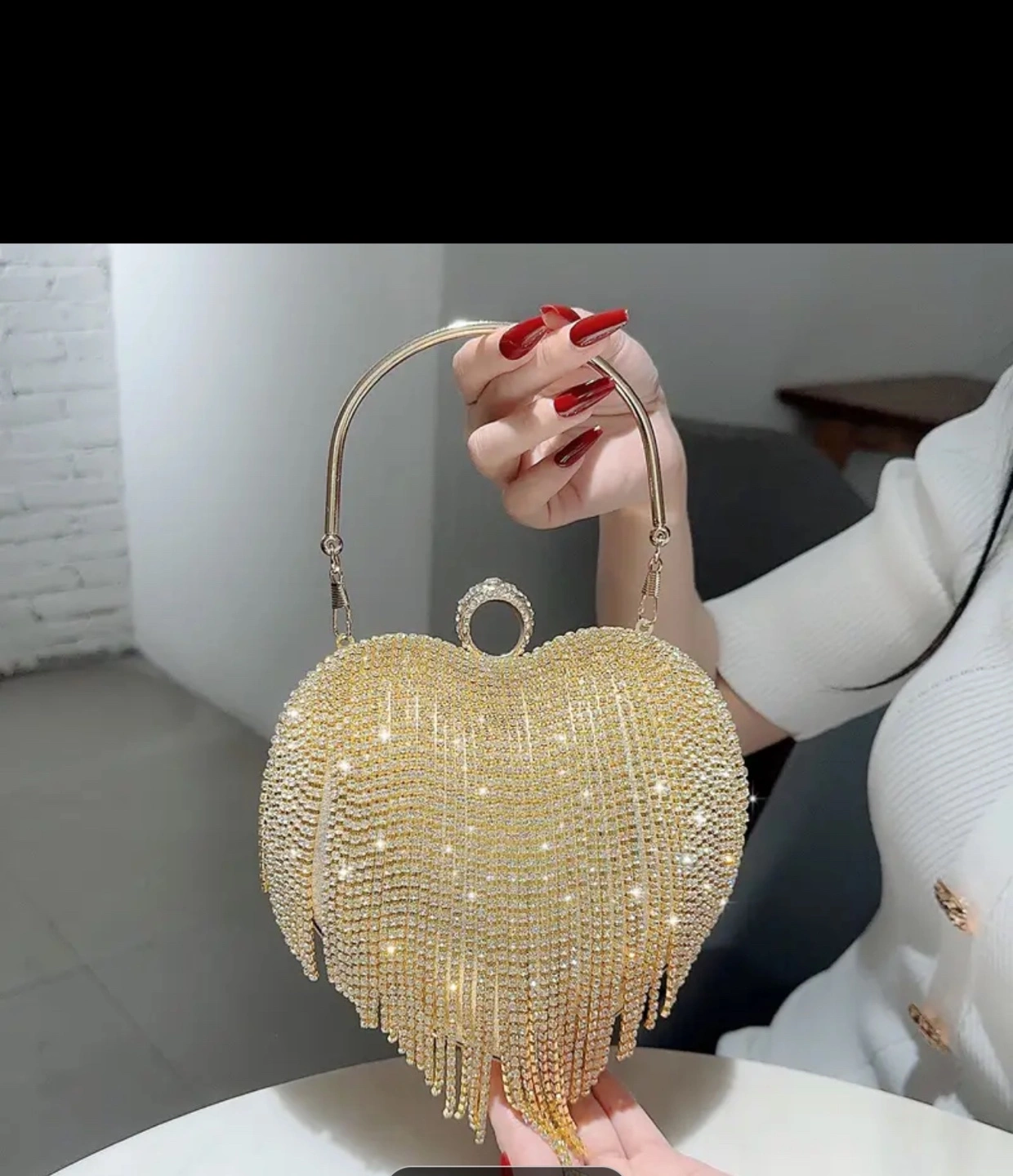 Sparkling gold heart-shaped clutch. Features a metal top handle and long rhinestone fringe. Perfect for a special occasion. Interior is lined in yellow satin.