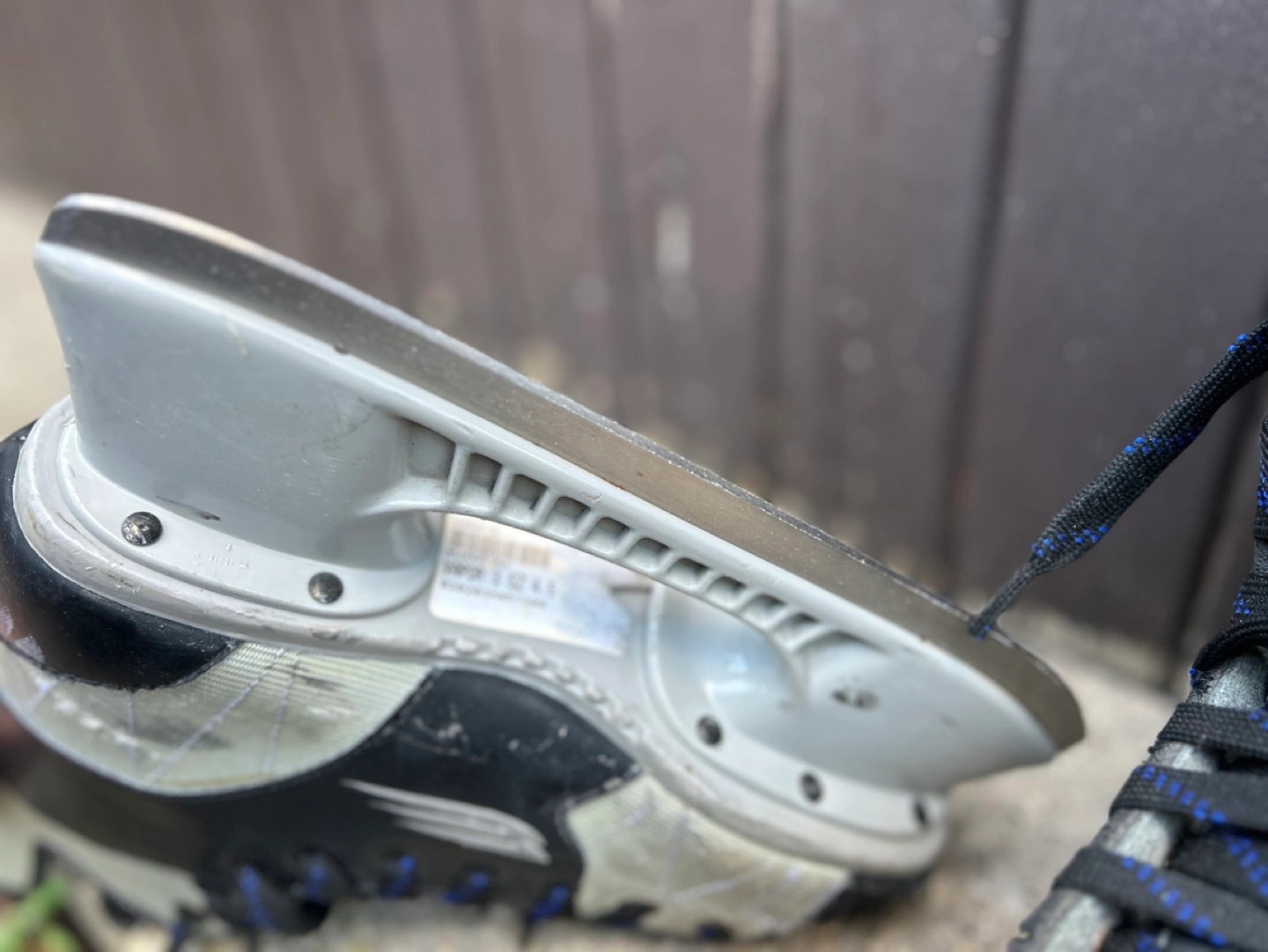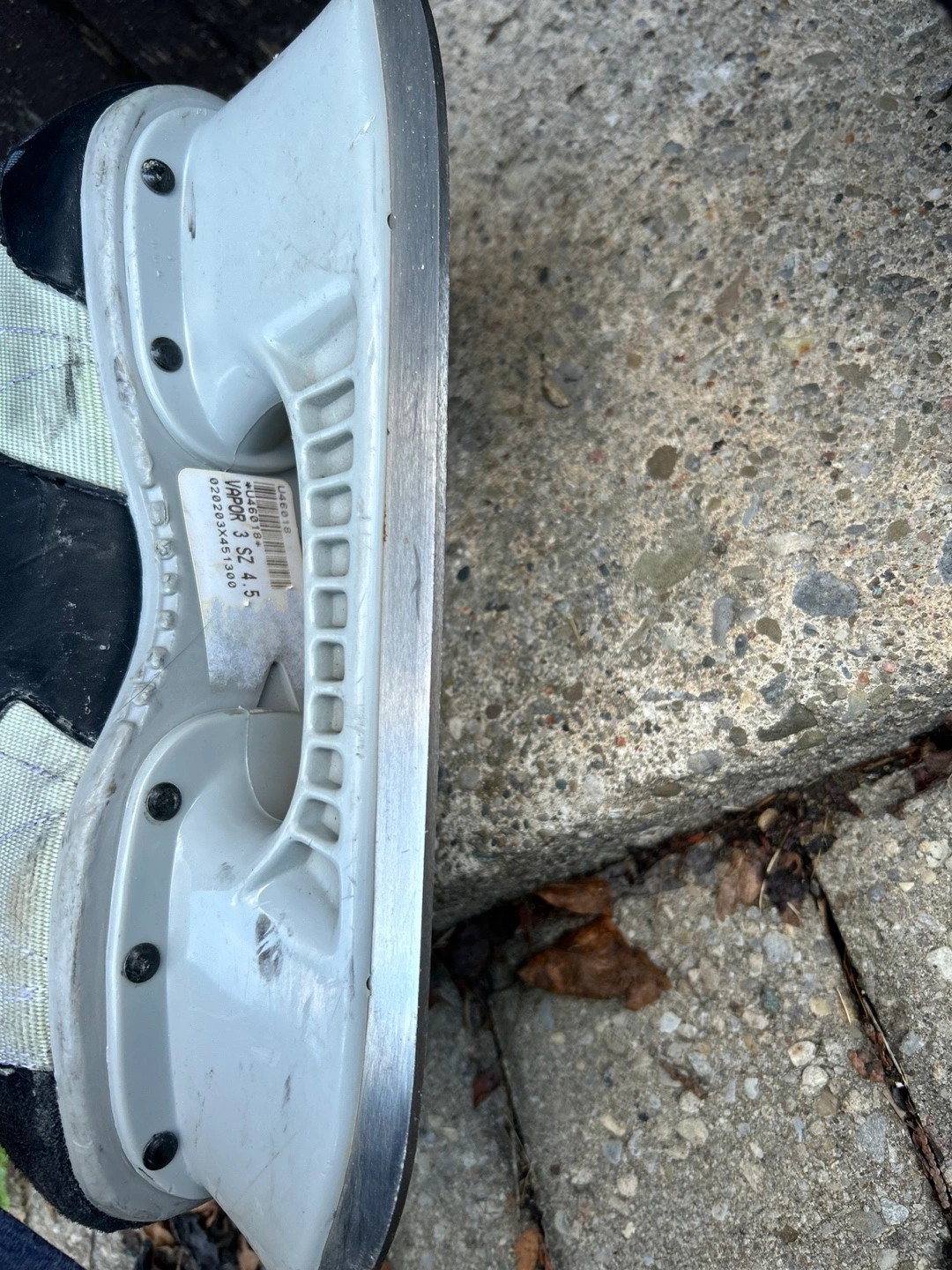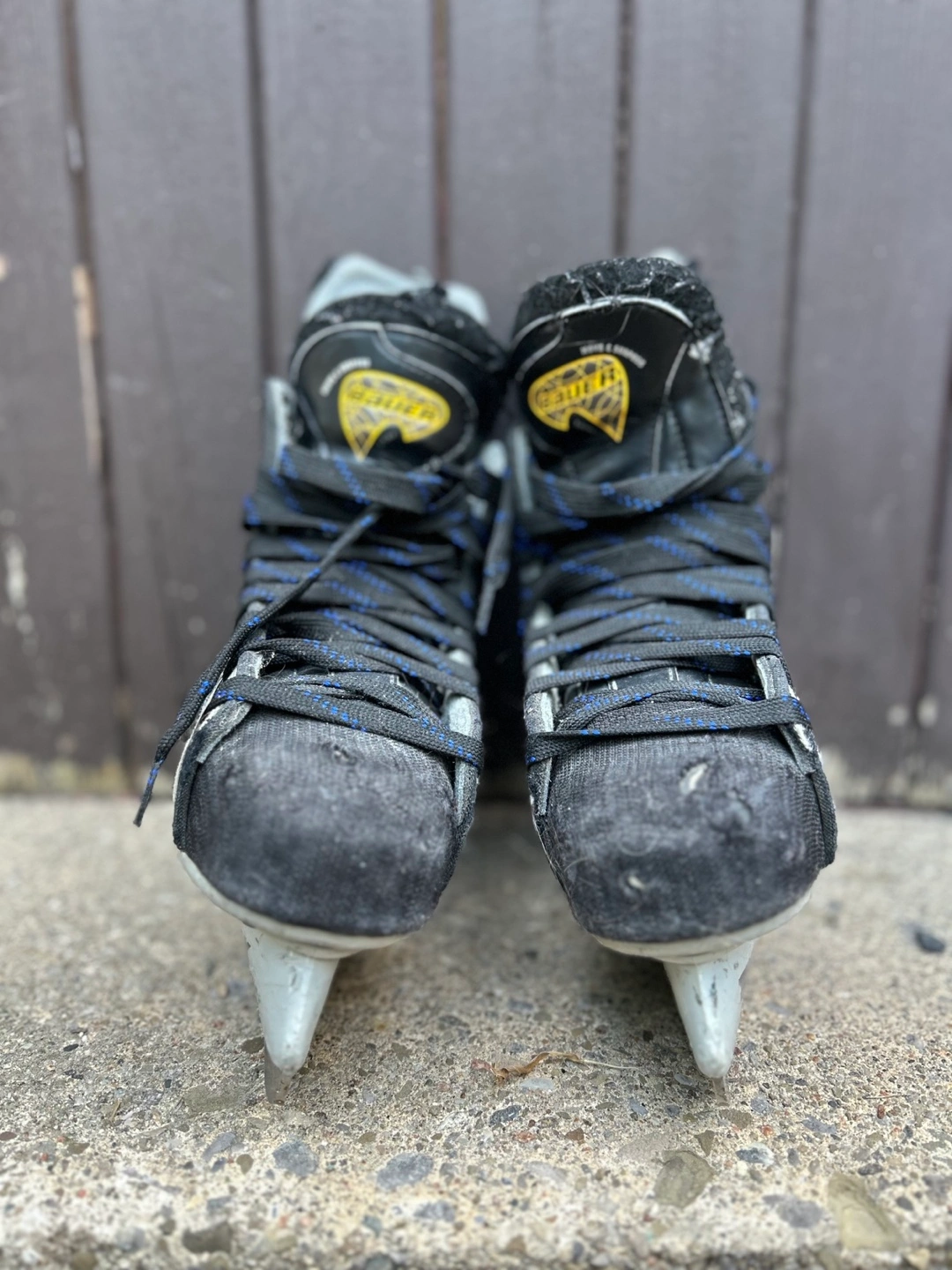 Used Bauer ice skates. Grey and black colour scheme. Side 5.5. Black laces with blue accents. Vapor V. Show some wear.