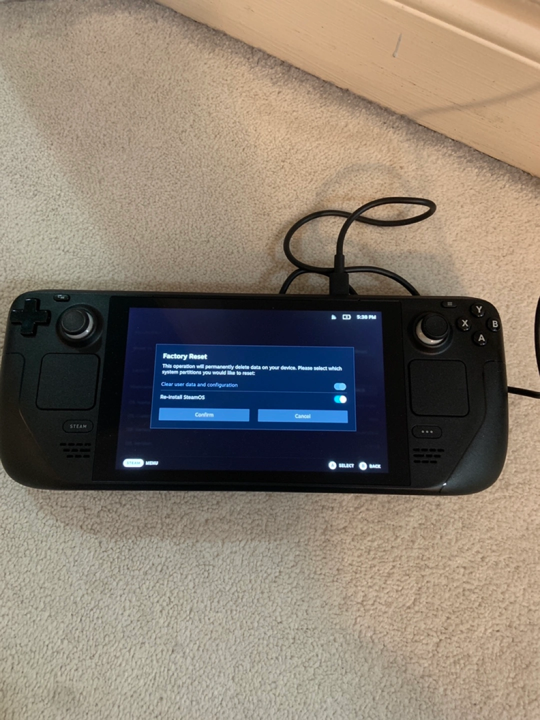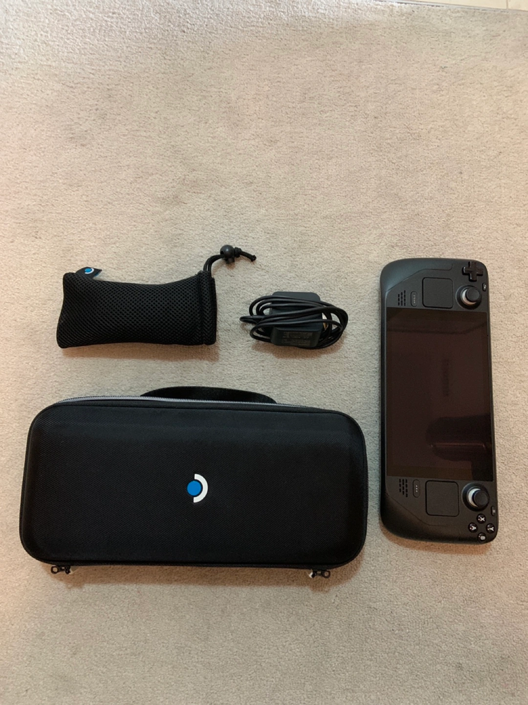 Portable handheld gaming PC. Includes carrying case, power adapter, and mesh carrying pouch. Runs SteamOS. Great for gaming on the go.