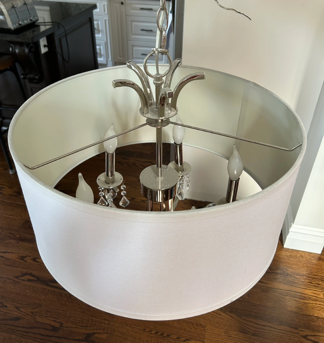 Chandelier boasts a drum shade and crystal accents. Excellent condition. LED bulbs included. $20 for the one chandelier
