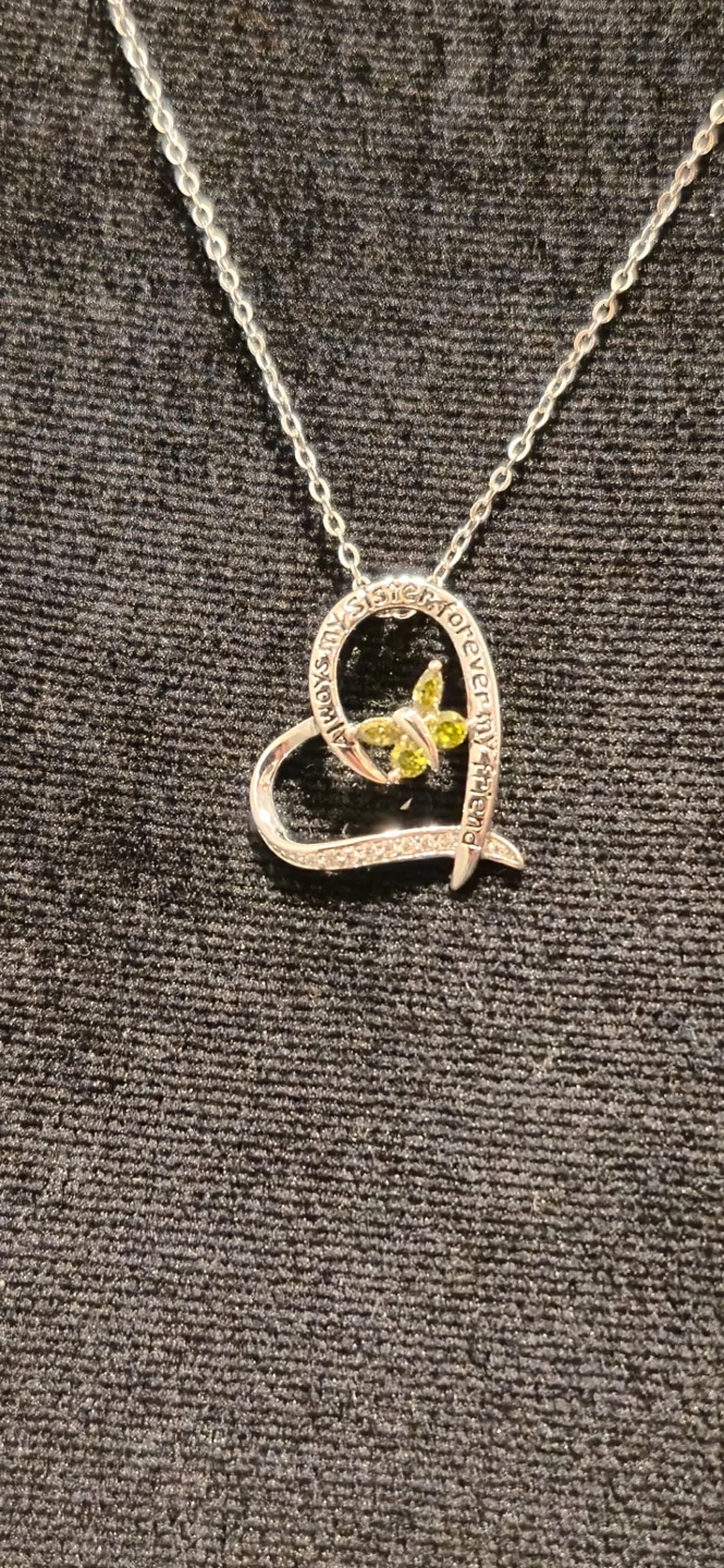 Lovely heart-shaped necklace. Features a small butterfly charm with green stones. Silver chain and clasp. Adjustable length.