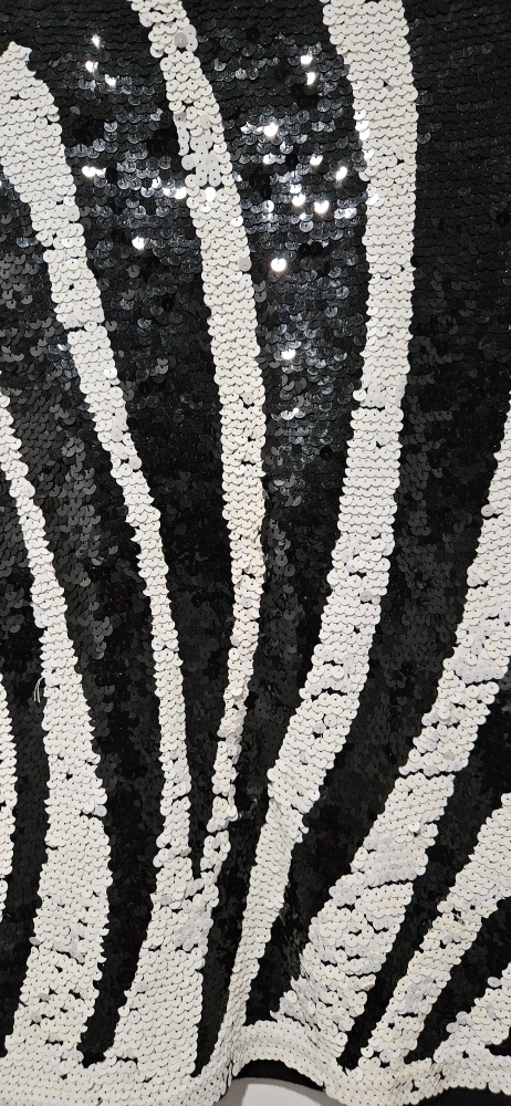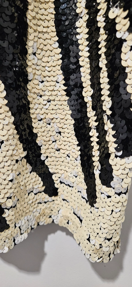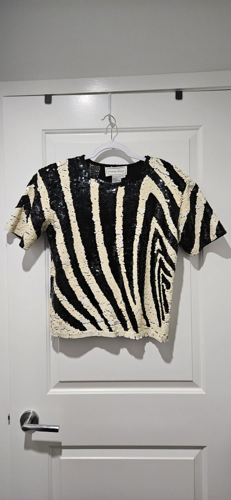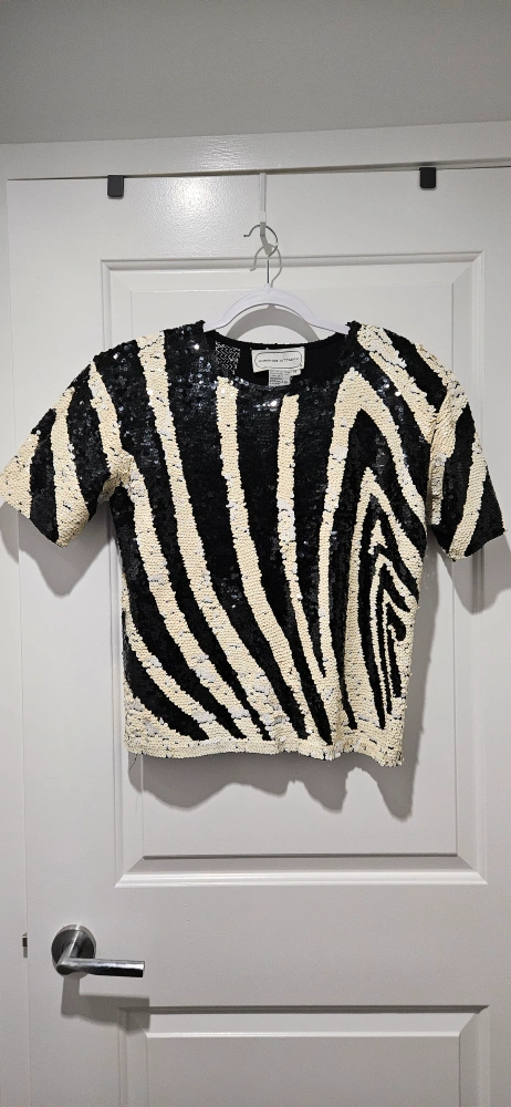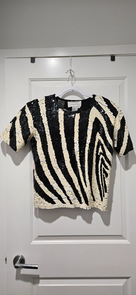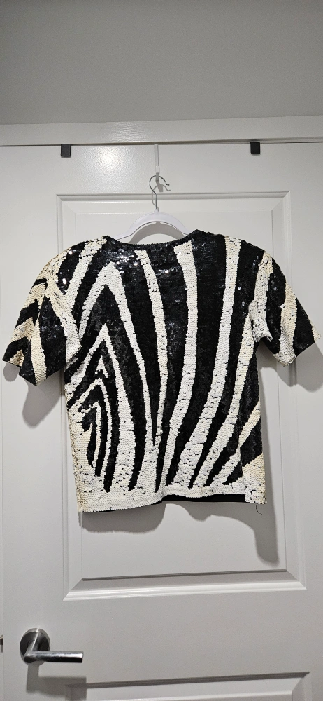 Virtually new, Stunning sequined top. Black and white zebra pattern. Short sleeves. 100% cotton. Perfect for a night out, dress down for a casual look, or for holiday season and Christmas party.