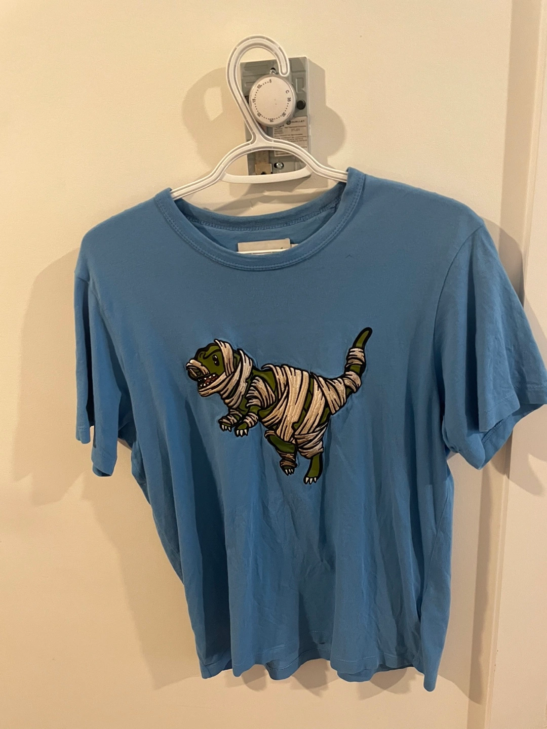129Men's short sleeve t-shirt. Light blue. Features a mummy dinosaur applique. Back features a colourful Coach logo.