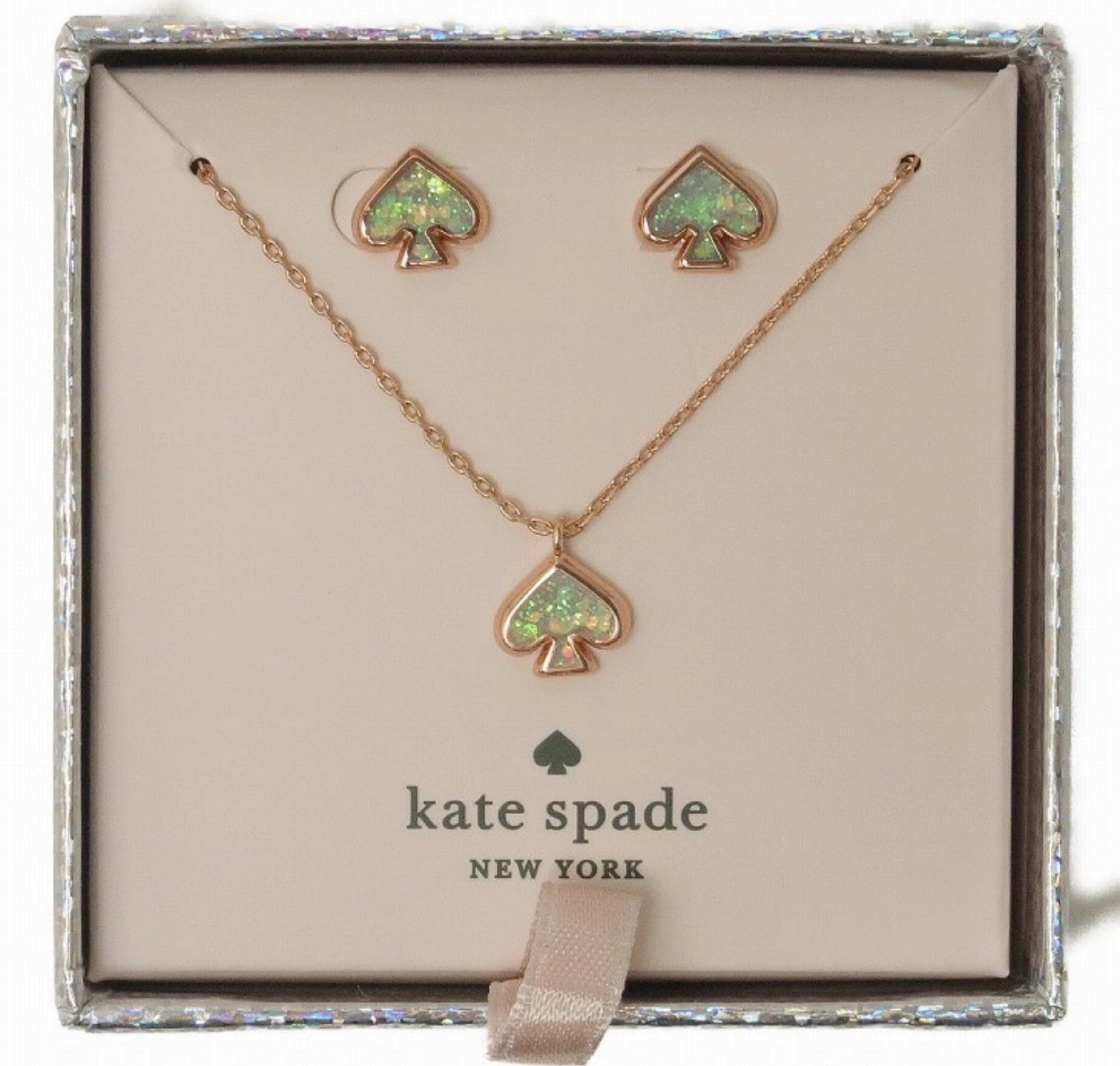 Gorgeous Kate Spade New York jewellery set. Features a rose gold necklace and matching earrings. Pendant and earrings shaped like spades. Green opal accents. New with tags.