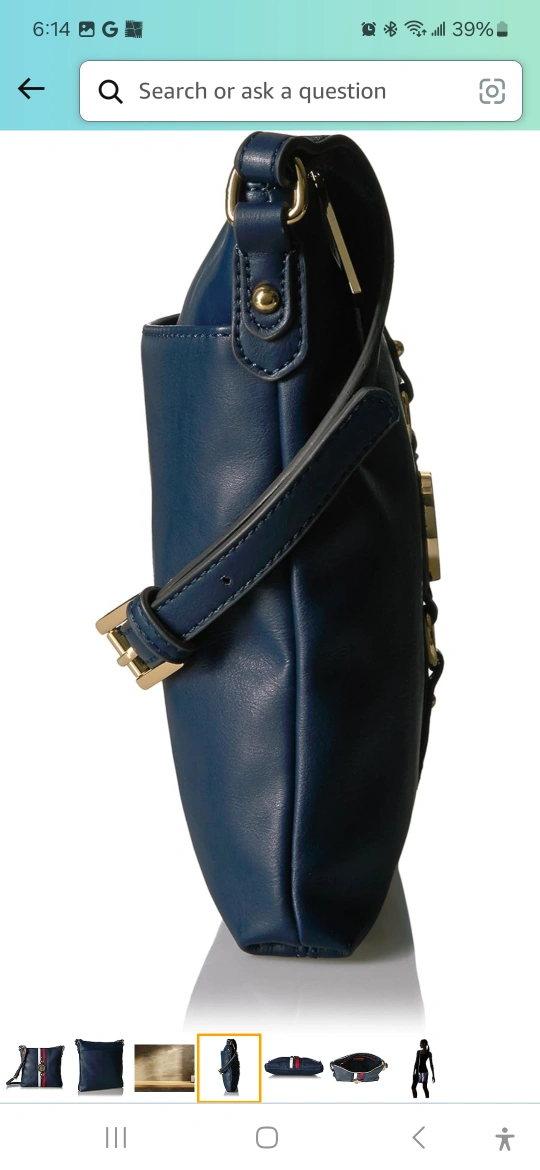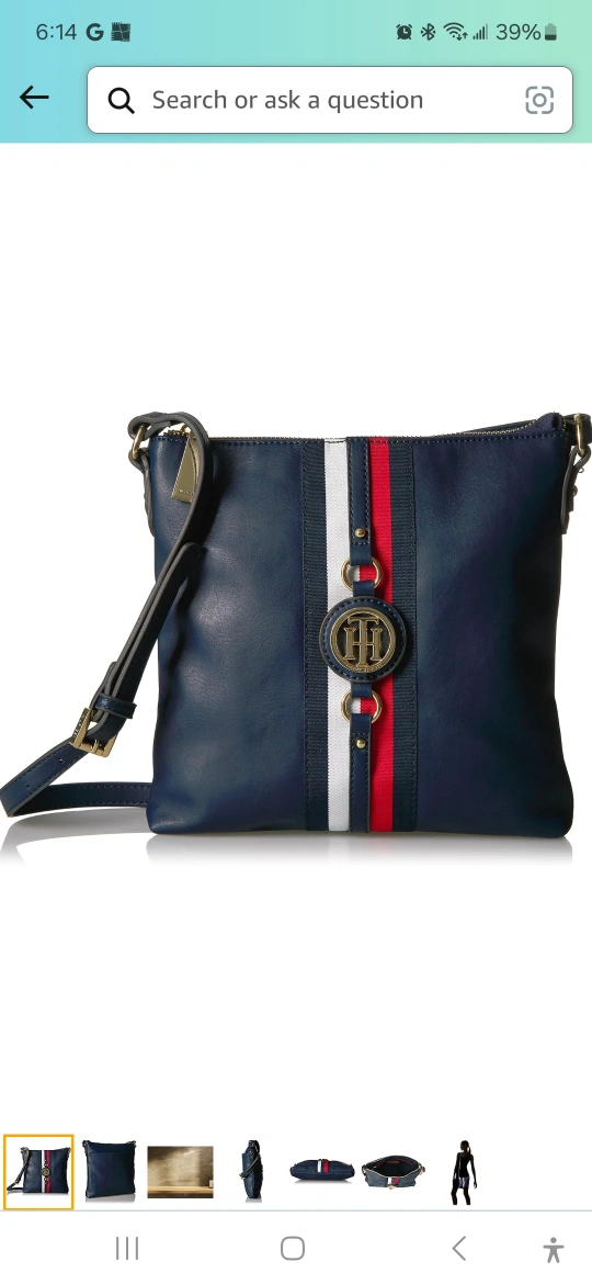 Stylish navy blue crossbody bag. Features a gold-toned logo and red and white stripes. Adjustable strap. Perfect for everyday use.