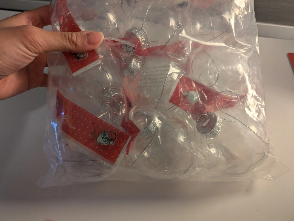 Set of twelve small, clear glass Christmas ornaments. Silver coloured caps and hanging strings. Packaged in a clear plastic bag. Perfect for crafting or decorating.