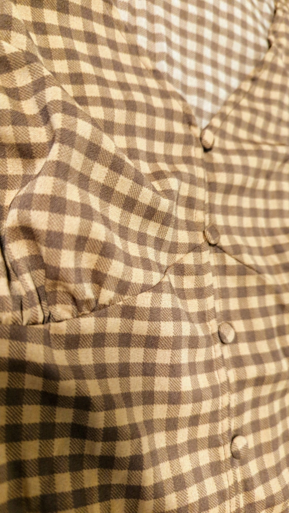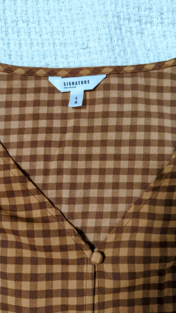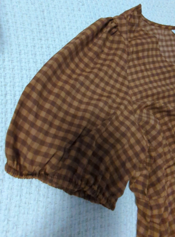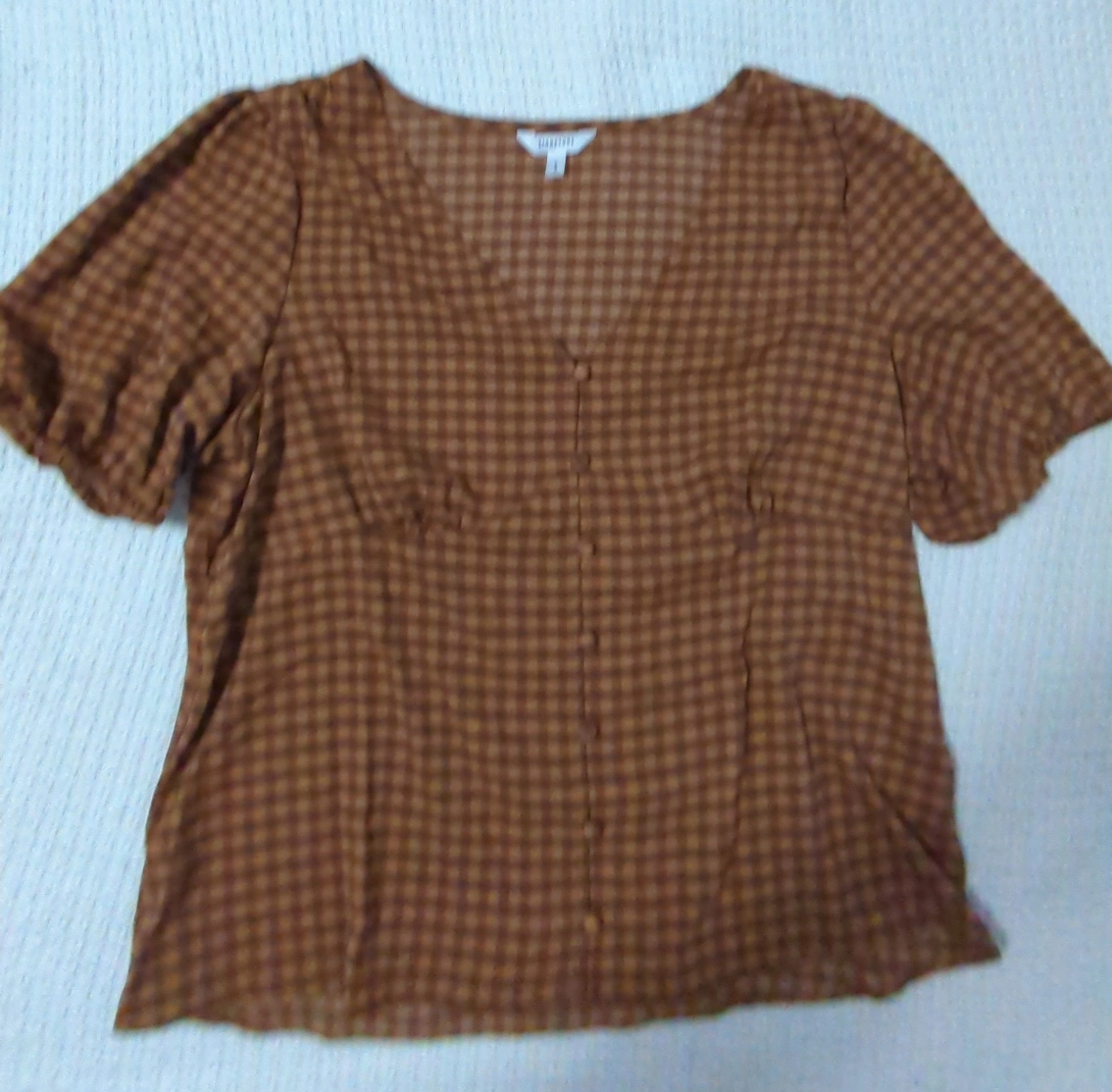 Women's brown and tan gingham blouse. Features a V-neck, short puff sleeves, and button closure. Size large. Cash or e-transfer only. Pick/meet up options: - Jane and Eglinton or - Dovercourt and Dundas West (Monday to Friday 8am to 1pm) - High Park or Keele station Monday to Friday 2:45pm to 3pm