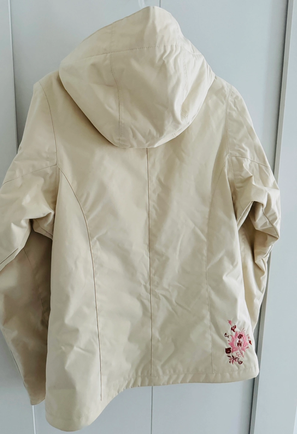 Cream-coloured women's Burton snowboard shell jacket. Size small. Features a hood and zip closure. Partial lining with a houndstooth pattern. Small embroidered floral detail on the back.