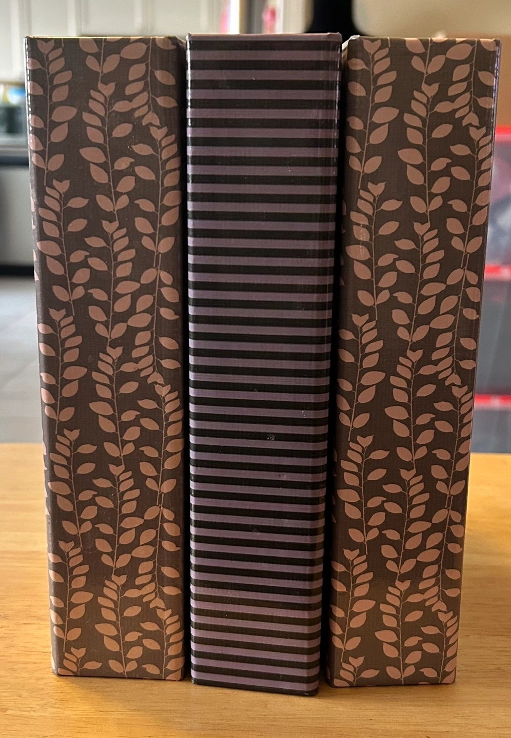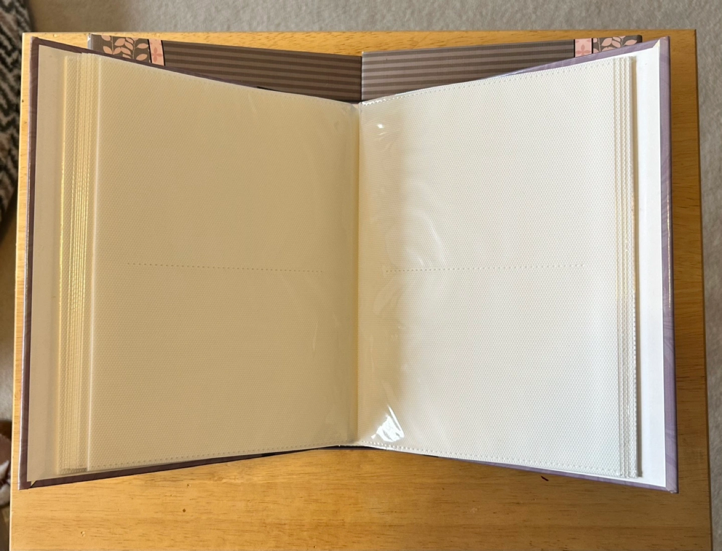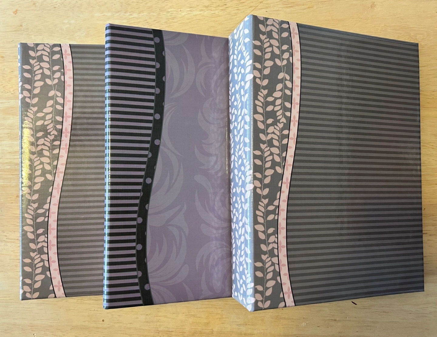 Set of three photo albums. Matching design. Purple and grey colours. Leaf and stripe patterns. Plenty of space for photos. $4 each or take all for $10 😊