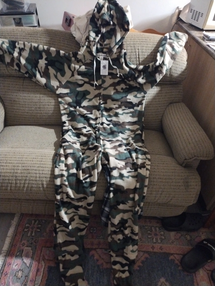 Adult-sized camouflage-print fleece onesie. Full-length zipper. Attached hood. Cozy and warm.
