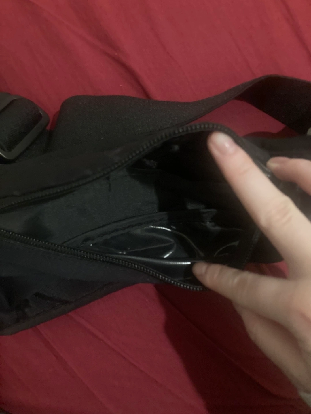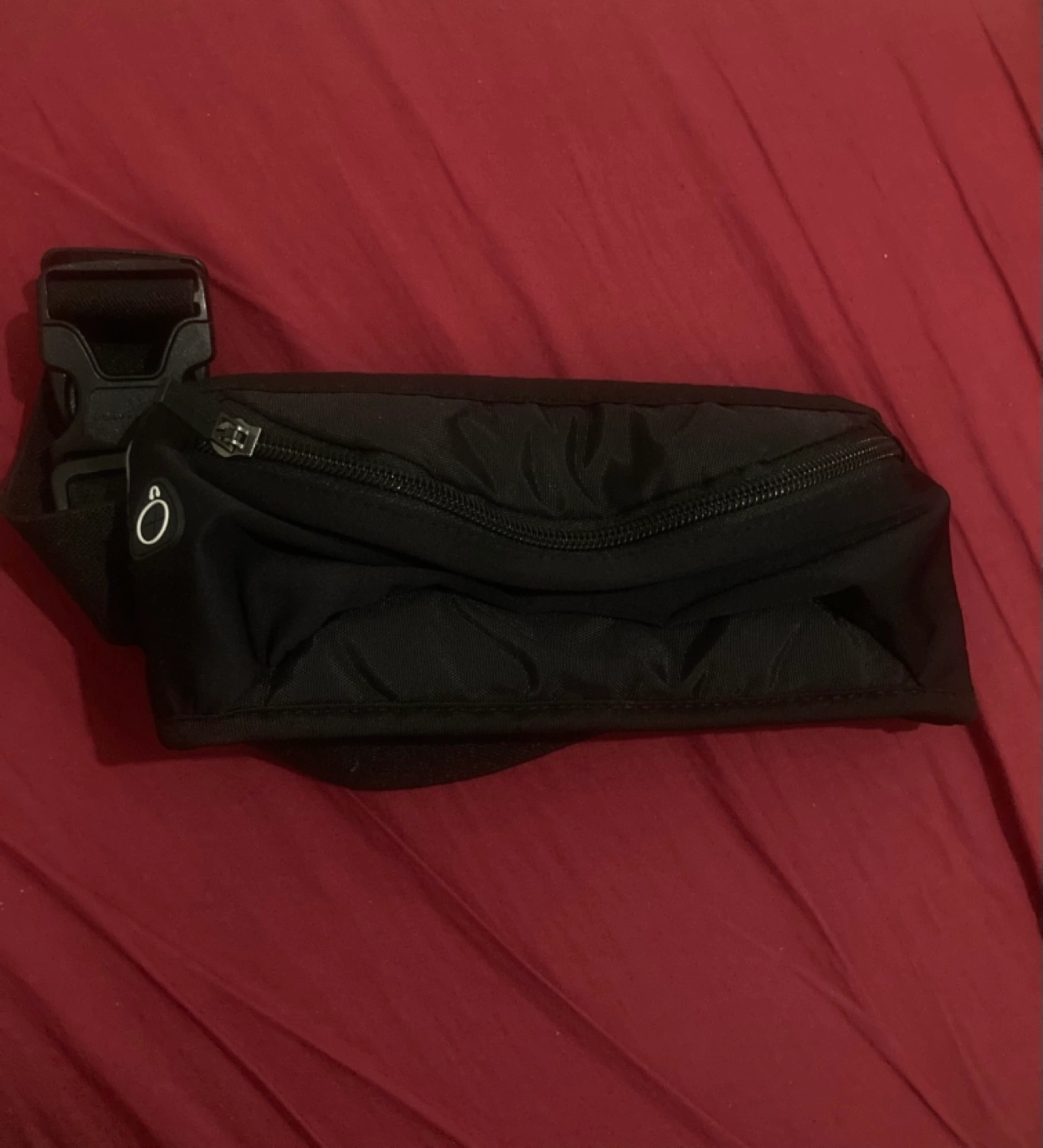 Small black running belt with adjustable strap and one zipper compartment.